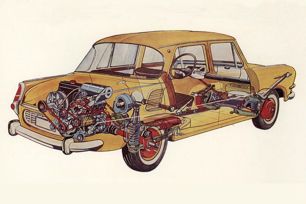 De nem volt ennyire egyszerű menet ez. Az 50-es évek tervgazdaságában a fejlesztés nem úgy ment, hogy gondoltak egy nagyot a mérnökök és megcsinálták, amit a legjobbnak gondoltak. A Skoda, ha tehette volna, orrmotoros elsőkerékhajtású autót tervez már akkor is, de egy ilyen típus fejlesztési költségei túl magasak voltak akkoriban még. A hagyományos építésről való áttérés közben be kellett iktatni egy köztes lépcsőt. Ez az elgondolás, illetve kényszer szülte a Renault 8-ast, a Simca 1000-est, de az NSU Prinzet is.