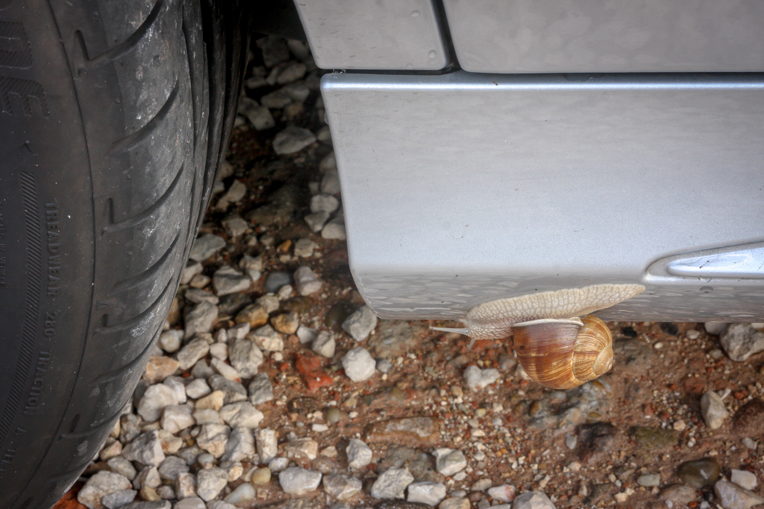 Nem tudom, mi volt a terve, amikor felkapaszkodott. Kalandvágy? Elzavarták otthonról? Én még nem láttam csigát, pláne ekkorát autóra mászni
