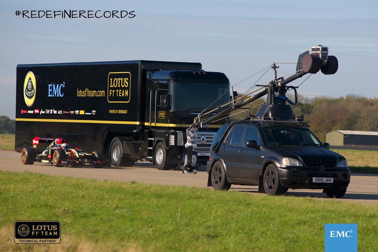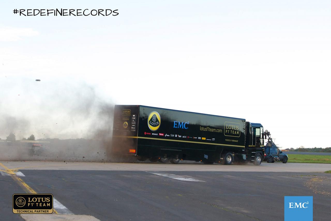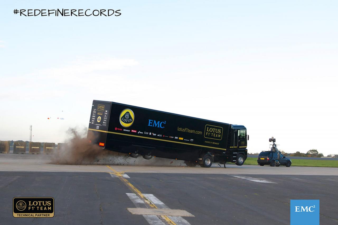 A kamionos ugratások hosszúsági rekordja (nem vicc), mint a videóból is látszik, megdőlt. 83 láb és 7 hüvelyk, magyarul 25,476 méter volt a repülés a rámpa vége és a nyergesvontató húzta félpótkocsi fara között mérve. Az akciót az Egyesült Királyságban, a suffolki Bentwaters Parkban hozták össze. A Renault Magnum volánjánál Mike Ryan, a Lotus kormányánál meg Martin Ivanov – mindketten gyakorlott kaszkadőrök. A videót az EMC reklámcéljaira használják, de egyben búcsú is a Renault-tól, a Lotus jövőre már nem francia motorral indul az F1-ben. A látszólag elég nagy költségvetésű videóhoz feláldozták a kamiont, nézd csak meg, milyen rendesen odaverték a flaszterhez.