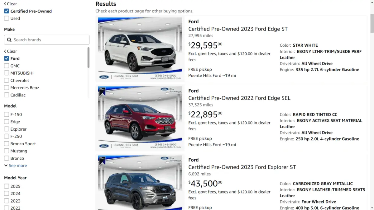 Nagyjából másfél éve jelentette be a Hyundai, hogy autókat fog árulni az Amazonon Németországban, az első hirdetések pedig tavaly decemberben jelentek meg a weboldalon. Ezt a példát követi most a Ford, bár az ő a kereskedőik nem új autókat, hanem ellenőrzött használt járműveket értékesítenek az Amazonon keresztül, így akár más márkájú, beszámított autók is kerülhetnek a platformra. Az árak és a feltételek továbbra is a kereskedők hatáskörébe tartoznak, de az ügyfelek böngészhetnek, vásárolhatnak, illetve hitelezhetnek is járműveket az Amazonon keresztül, majd egyeztetett időpontban átvehetik az autót a kereskedésben. A vásárlók éppen ezért csak a 75 mérföldes körzetben elérhető autók között keresgélhetnek. Vásárlás előtt nem csak az árakat, hanem a jármű szervizelőéletét, a teljes specifikációt és az állapotfelmérés eredményét is megtekintheti a vevő. Minden Ford kereskedő által az Amazonon értékesített járműre 14 napos, 1000 mérföldes pénzvisszafizetési garancia vonatkozik, illetve út széli segítségnyújást is vállal a kereskedői hálózat. Először a Los Angelesben, Seattle-ben és Dallasban található autók kerülnek fel Amazonra, ám hamarosan további területek is csatlakoznak. Los Angelesben, kizárólag Fordokra keresve már most is rengeteg a találat, ahogy azt az alábbi képernyőfotó is igazolja.