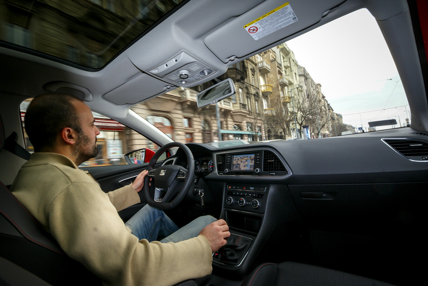 Az utastér nem hoz meglepetést annak, aki az aktuális Leont (vagy a Golfot, vagy az Octaviát) már ismeri. Helyből bőven van elöl és hátul is, az anyagok és a kidolgozás minősége érzetre sokkal jobb az előző Leon-generációhoz képest. A felszereltségi listából mazsolázva: a belépő-becsali Entry verzió is menetstabilizálós, 7 légzsákos, a többszörös ütközést megelőző rendszerrel ellátott (törésteszt-eredmény: fényes 5 csillag), isofix-csatlakozók a két szélső-hátsó helyen várják a gyereküléseket, első elektromos ablak és elektromos tükör van, klíma nincs. Légkondi a Reference szinttől jár (a Style-nál és az FR-nél kétzónás automata). A nagyon látványos Full LED-es első (és hátsó) lámpa Style-tól fölfelé rendelhető, miként például még a navigáció is (akár már magyar nyelvű) a Media System Plus 5,8 colos színes érintőkijelzővel – alapvetés, hogy a Style és az FR szintek már tejben-vajban fürösztenek, de a Reference is élhető, korrekt. Még egy vonatkozó mondat: adaptív tempomat, front assist forgalomfigyelő, fényszóró-asszisztens, sávtartó asszisztens, fáradtságérzékelő, panorámatető, alcantara sportülés, 18-as felni, adaptív felfüggesztés, progresszív kormány, szinte minden elérhető jó pénzért.