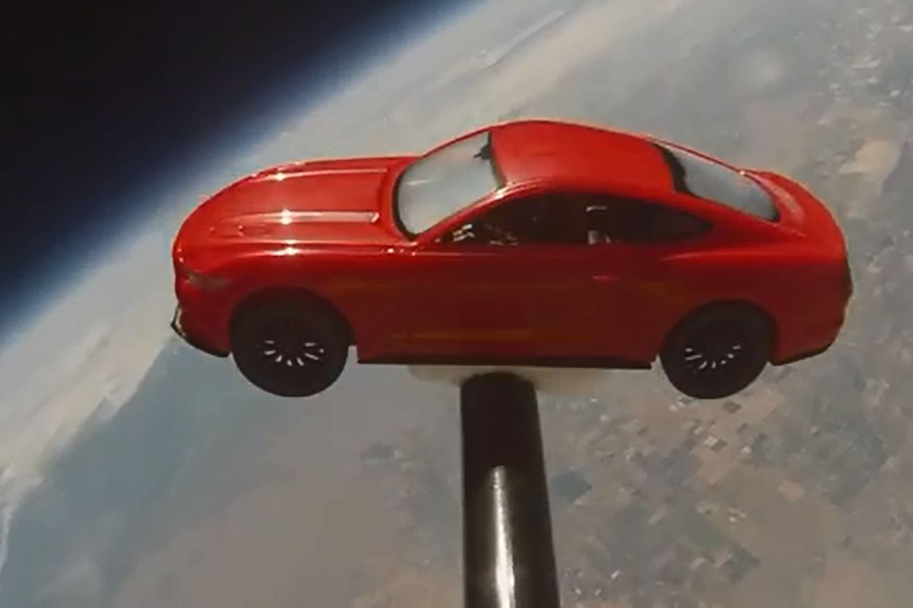 A Mustang születése pont a hatvanas évek űrversenyének a csúcsára esett, mégis kellett ötven év, mire a kocsi eljutott az űrig. Na persze nem egy valódi kocsi, csak egy Revell modell. A kis piros játékautót egy nagy magasságokig használható, időjárási megfigyelésekhez használt hőlégballonnal juttatták a magasba. Ha kukacoskodni szeretnénk, akkor szóvá tehetnénk, hogy ez még nem a világűr, mert az a 100 km magasságban meghatározott Kármán-vonalnál kezdődik. Bár a makett csak a Sztratoszféráig jutott, de azért a 110 ezer láb (33,528 km) is jó magasan van. A Mustang így hasonló űrkarriert futott be, mint az ilyen magasságig egy Mig-32-essel repülő celebhölgyünk, Anettka. A videón látható kisautó 74 perc és a ballon kipukkadása után elkezdett visszazuhanni a Földre, a rászerelt GPS jelei alapján találták meg.