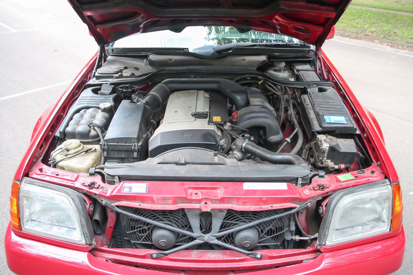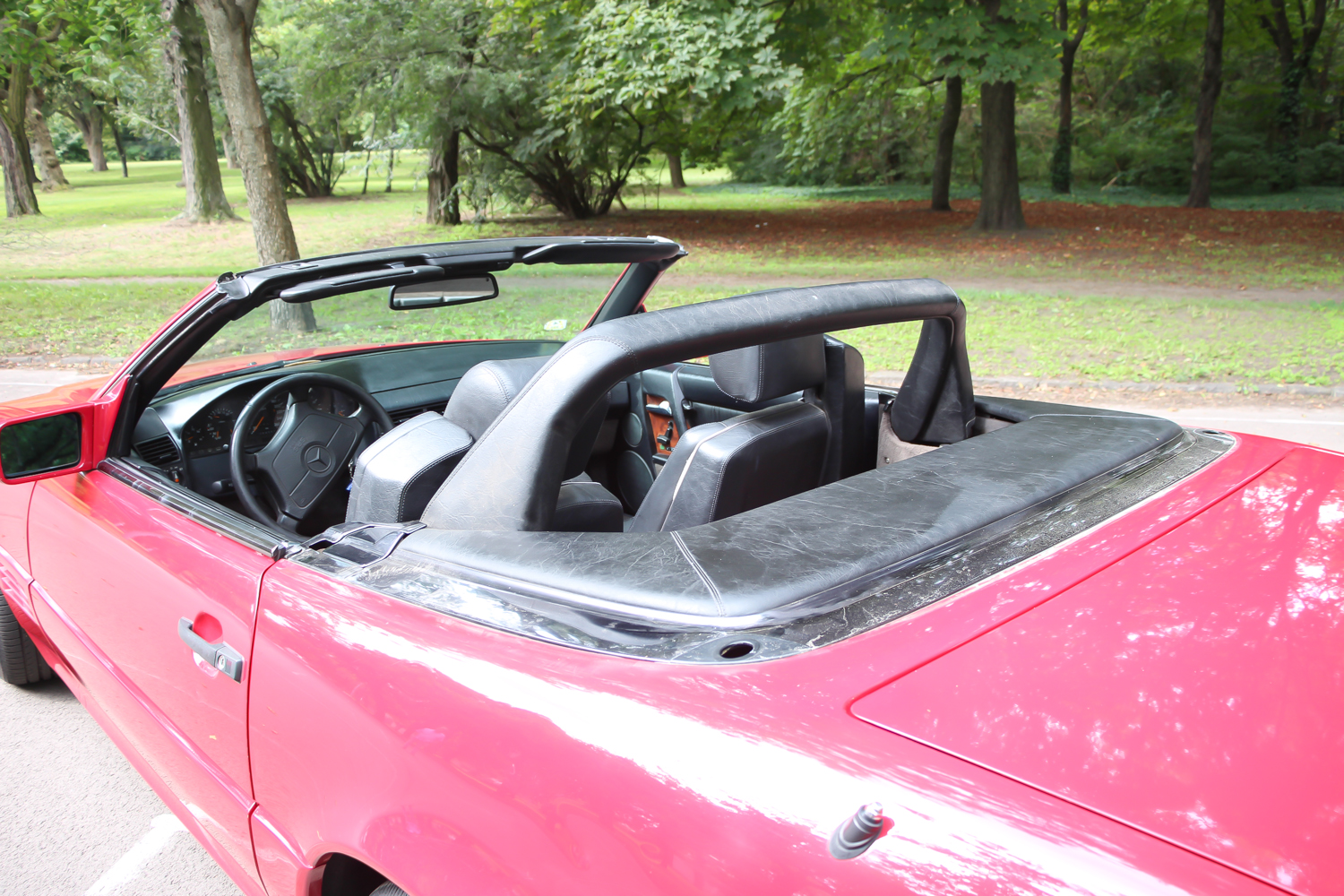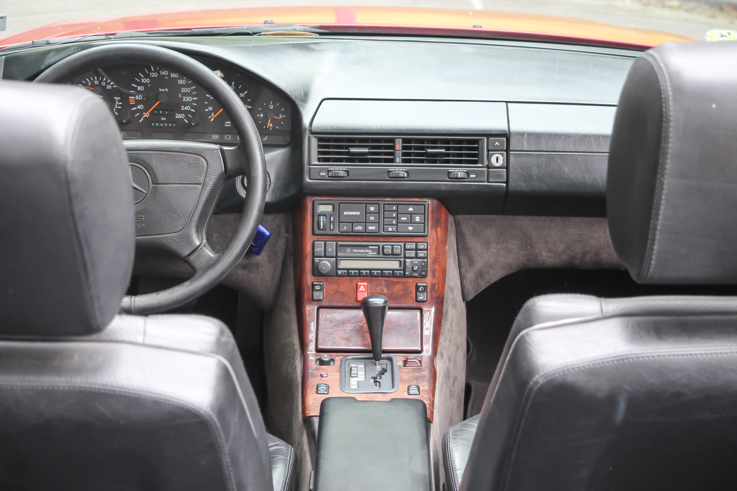 Az alsó burkolatok és a motortérben tervezetten mozgó levegő annyit számít, hogy keménytetővel 0,32 az alaktényezője, de nyitott tetővel és felhúzott ablakokkal is csak 0,4. Mindez egy akkora dögnagy autóban, ami 5 centiméterrel hosszabb a 190-esnél, de tengelytávja csak 2515 milliméter. Ettől lesz annyira hangsúlyos a hátsó túlnyúlása, nem hat platós kistehernek, de valahogy nagyon áll az úton. Nem itt jelent meg, de itt néz ki talán a legjobban az óriási csillag a hűtőmaszkon, felette a dicsőséges Benz-koszorú. Ez a példány még az 1995-ös ráncfelvarrás előtti, de az 1989-ben, Frankfurtban bemutatotthoz képest sok változás van már ezen a piros kocsin is. Már nem szögletesek a lukak a felnin, hanem az újabb 8 íves lukú kerék van rajta. Újabb a légzsákos kormány, ez már a kilencvenes években jellemző darab, ami a W140-es szériával jelent meg.