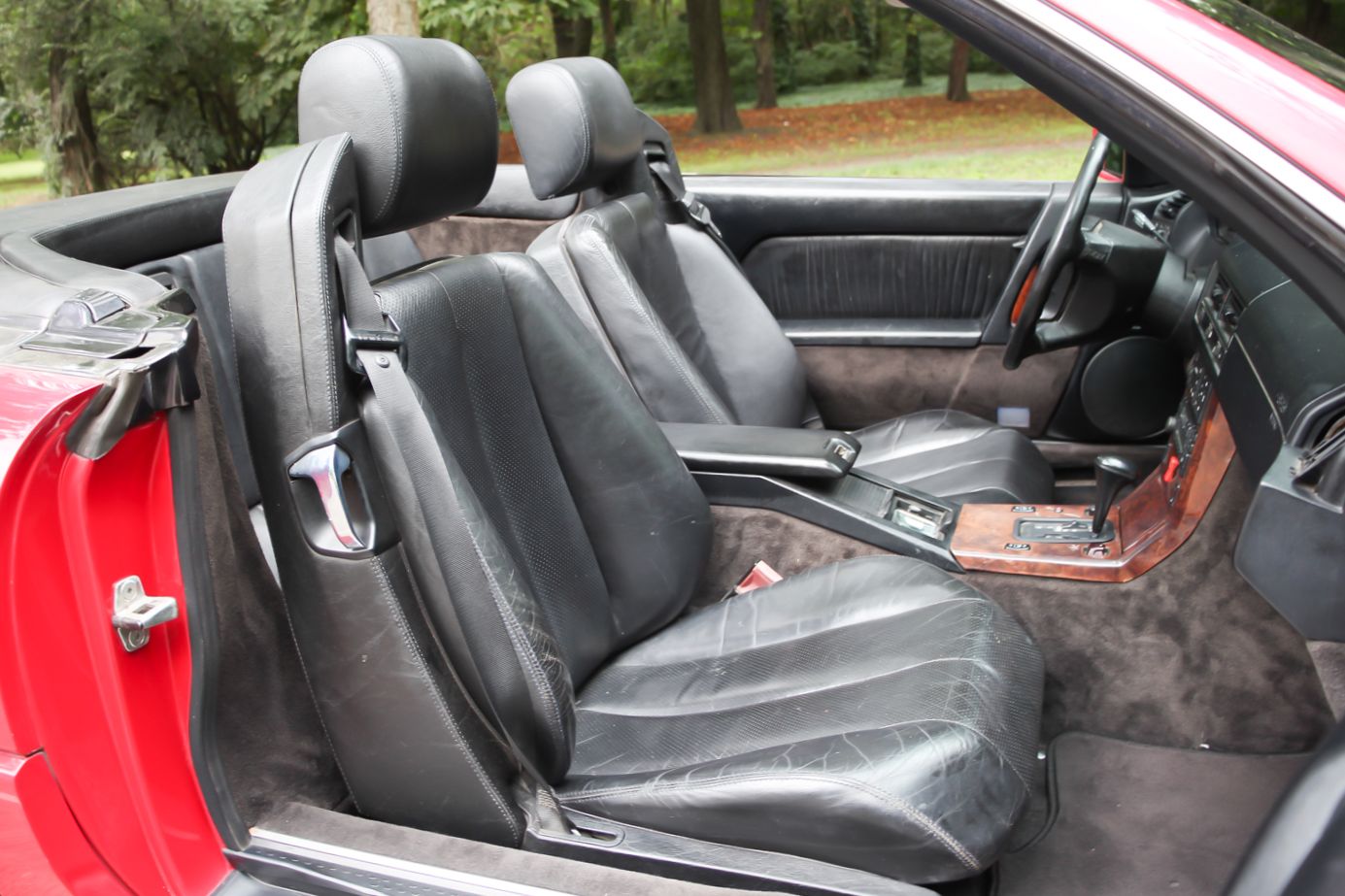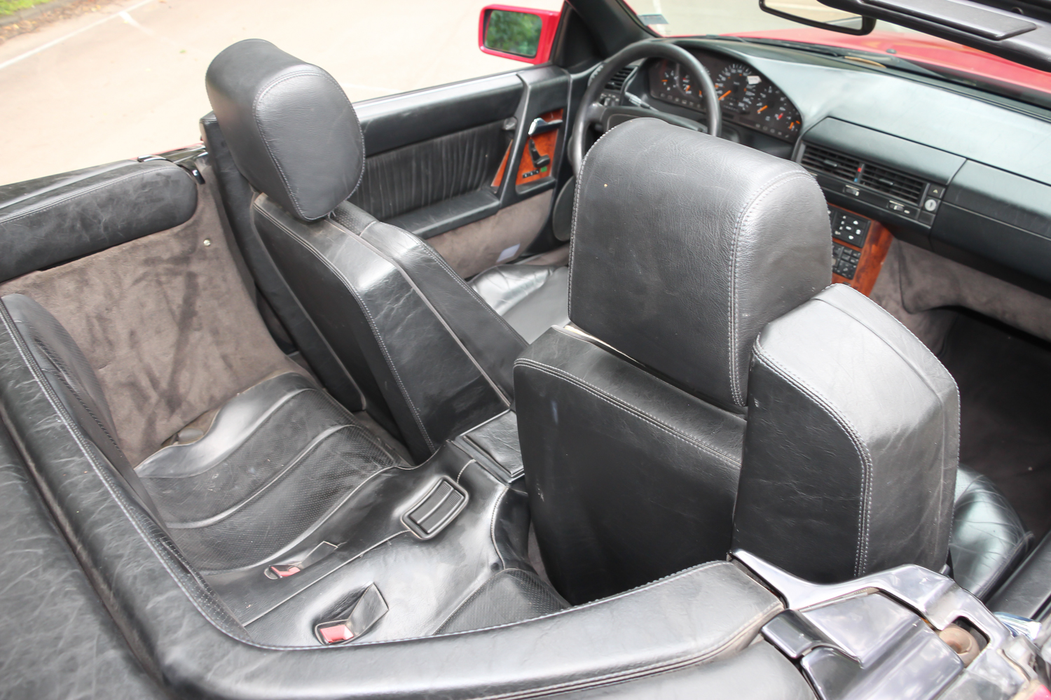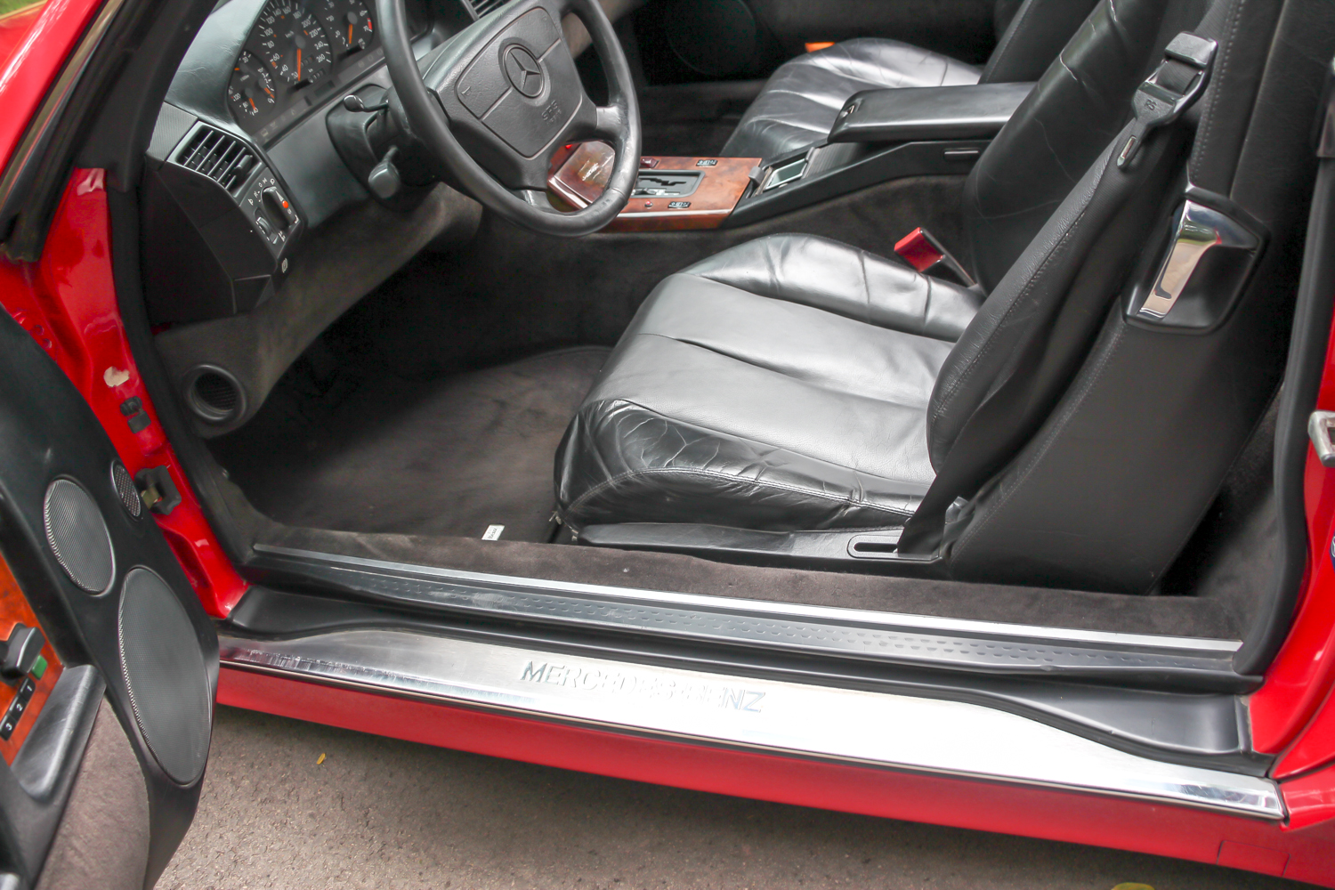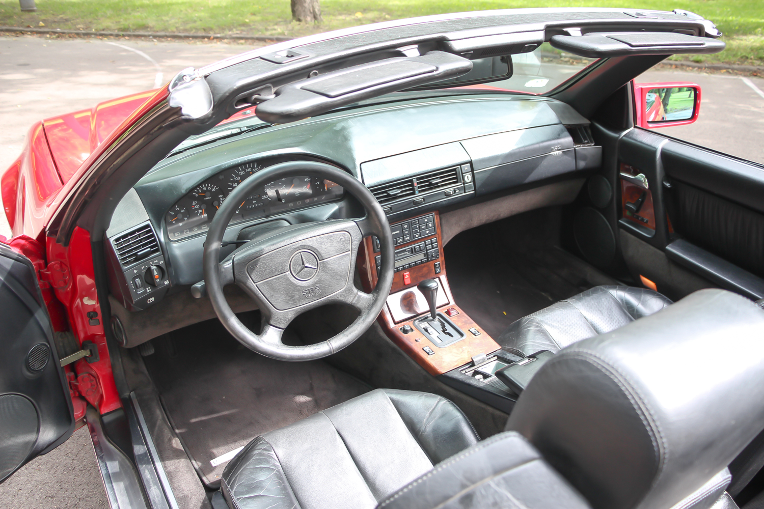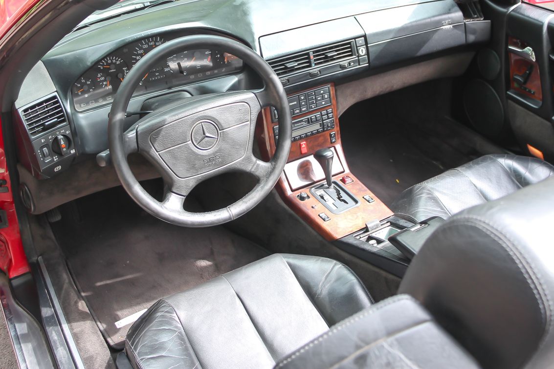 A nemsokára 21 éves SL méretes ajtaját kitárva egy megfelelően vastag küszöb fogad, rajta a márkánál szokásos küszöbdíszléccel. Az ülések jó mélyen vannak, itt értelmet nyer a roadster jelleg, de csakis a maga tankos, agyonbiztosított módján. Az ülések elég jól formázottak, az ülőlap meredeken áll, de az első éle le van csapva. Formája kicsit sem hasonlít az egyszerűbb Mercedes-szedánokéra, de a kényelme igen. Máris a maga korában sztenderd, óriási kormánykerék mögött ülünk. Széria a két légzsák, ezért az utas előtt nincs kesztyűtartó, de a középső légrostélyok felett van egy kicsi, természetesen kulccsal zárható rekesz. A többirányú ülésállítás eredményeképp könnyű kényelmet találni, a két ülés közötti karfa állítható. Az első két fotel mögött a Porsche 911 mintájára van két lehajtható szükségülés. Ide csak gyerekek ülhettek – még abban az időben, amikor a gyerekülés nem volt általános. Ma már senkinek nem ajánlanám.