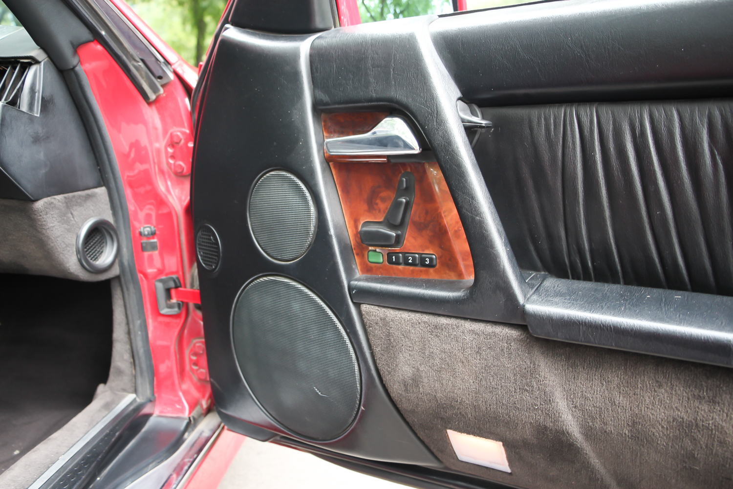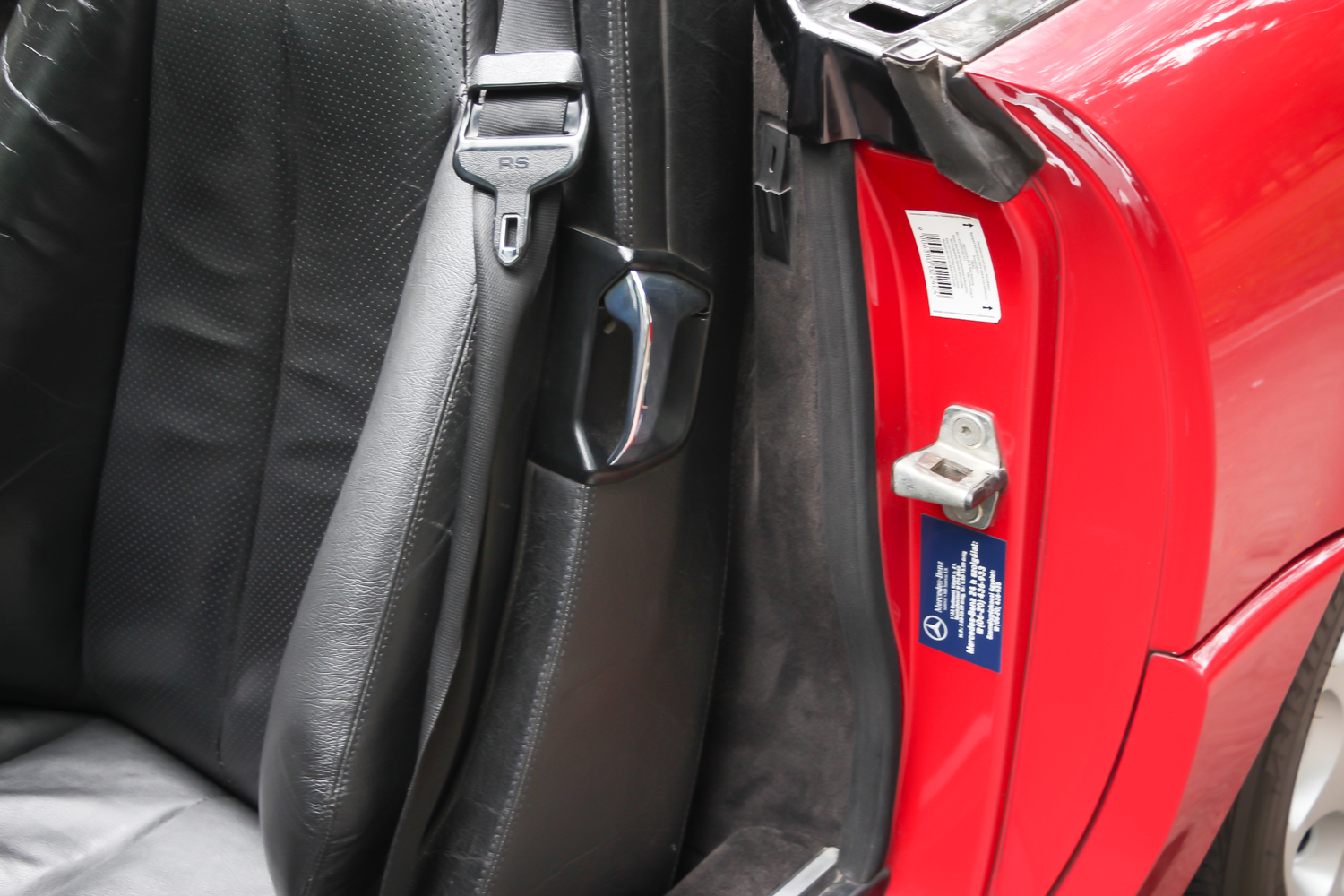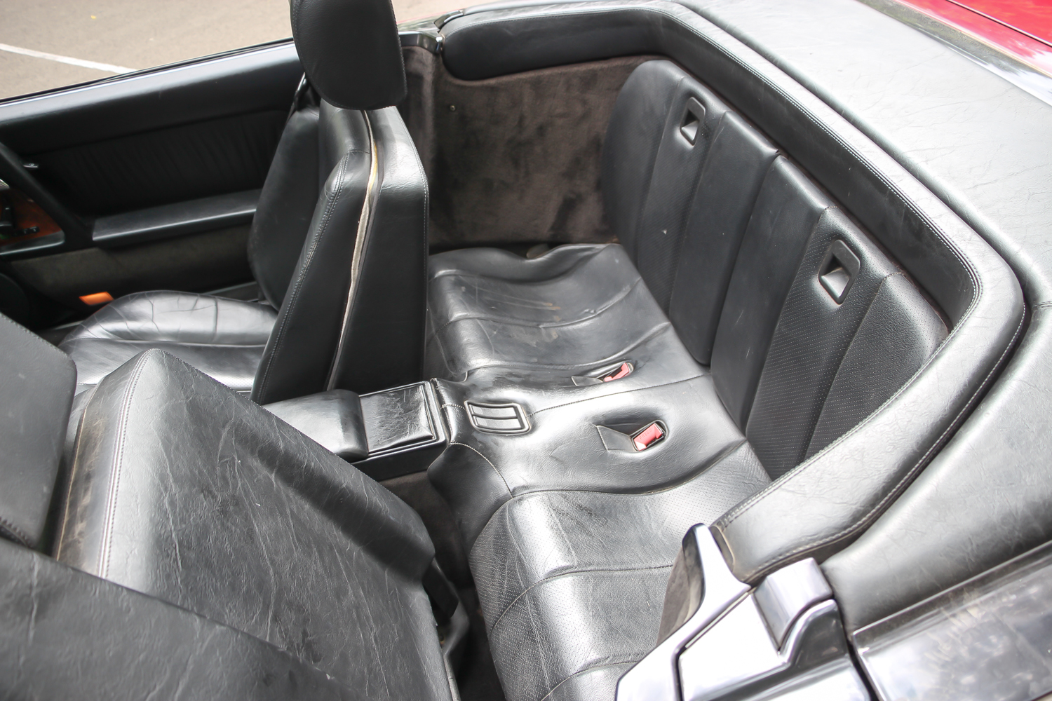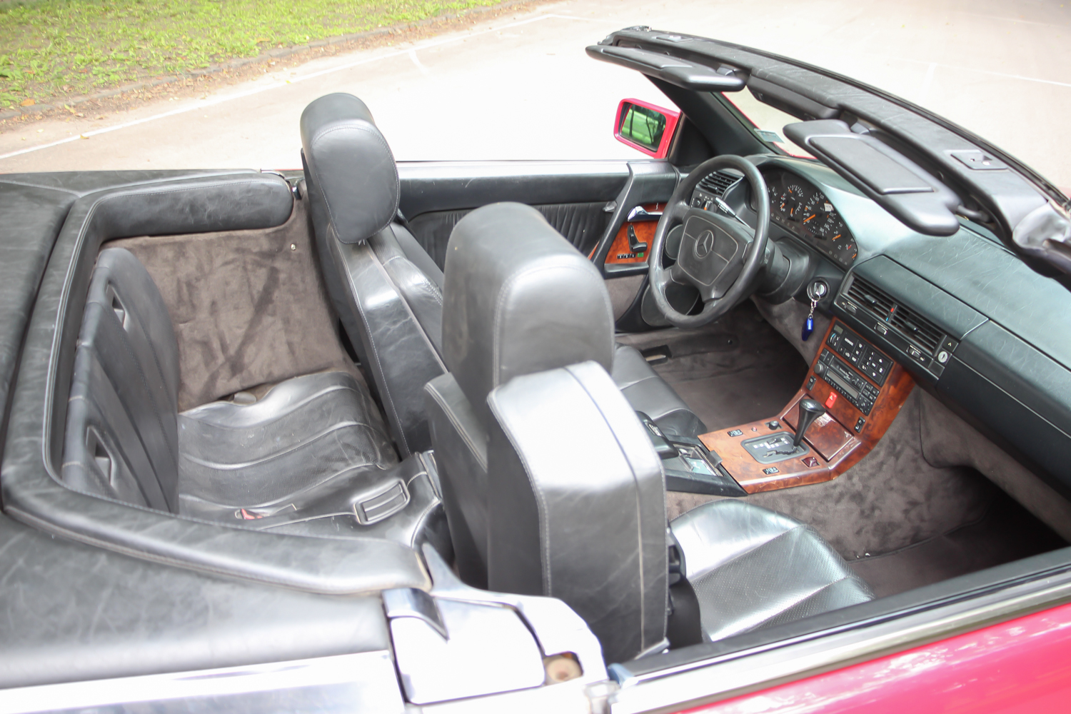 A nemsokára 21 éves SL méretes ajtaját kitárva egy megfelelően vastag küszöb fogad, rajta a márkánál szokásos küszöbdíszléccel. Az ülések jó mélyen vannak, itt értelmet nyer a roadster jelleg, de csakis a maga tankos, agyonbiztosított módján. Az ülések elég jól formázottak, az ülőlap meredeken áll, de az első éle le van csapva. Formája kicsit sem hasonlít az egyszerűbb Mercedes-szedánokéra, de a kényelme igen. Máris a maga korában sztenderd, óriási kormánykerék mögött ülünk. Széria a két légzsák, ezért az utas előtt nincs kesztyűtartó, de a középső légrostélyok felett van egy kicsi, természetesen kulccsal zárható rekesz. A többirányú ülésállítás eredményeképp könnyű kényelmet találni, a két ülés közötti karfa állítható. Az első két fotel mögött a Porsche 911 mintájára van két lehajtható szükségülés. Ide csak gyerekek ülhettek – még abban az időben, amikor a gyerekülés nem volt általános. Ma már senkinek nem ajánlanám.