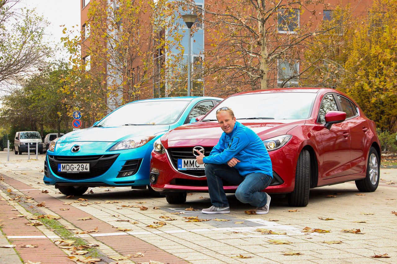 Ha már egymás mellé tettük a két Mazda3-ast, a piacról most kifutót és a most befutót, elhívtuk a fotózáshoz Lázár Pétert, aki nem egy nagy celeb, viszont neve kezd összeforrni a Mazdával. Második hatosa mellett az elmúlt években komoly szerelembe esett egy NB MX-5-tel, s miután a Mazda Motor Hungary is megismerte egészen művészi autófotóit, két újságíró mellett ő volt az a blogger, aki Magyarországról részt vehetett a Mazda3 Hirosima-Frankfurt expedícióján, pontosabban annak Tyumen-Moszkva etapján. Ő tehát már egy hetet élt úttalan utakon az új Mazda3-ban, majd elkísérte a már hazai autókat a szalonokban tartott premierekre is (beszámolói a peterlazar.com címen olvashatók). Az autóról kérdezve röviden csak annyit mondott, hogy a G120-as motor teljesen elegendő hozzá, meg persze azt, hogy jó volt benne az az egy hét, s jó volt itthon is vezetni, bár a magyar utakon sajnos feltűnt, hogy azok néhol nem jobbak, mint az oroszországiak, a hozzánk érkezett autókra húzott Toyo abroncsok pedig zajosak – ezt sajnos meg tudjuk erősíteni. Amúgy az autót a kategória egyik legjobbjának tartja – bevallottan nem elfogulatlanul, ezért inkább azt javasolta: próbáljuk ki.