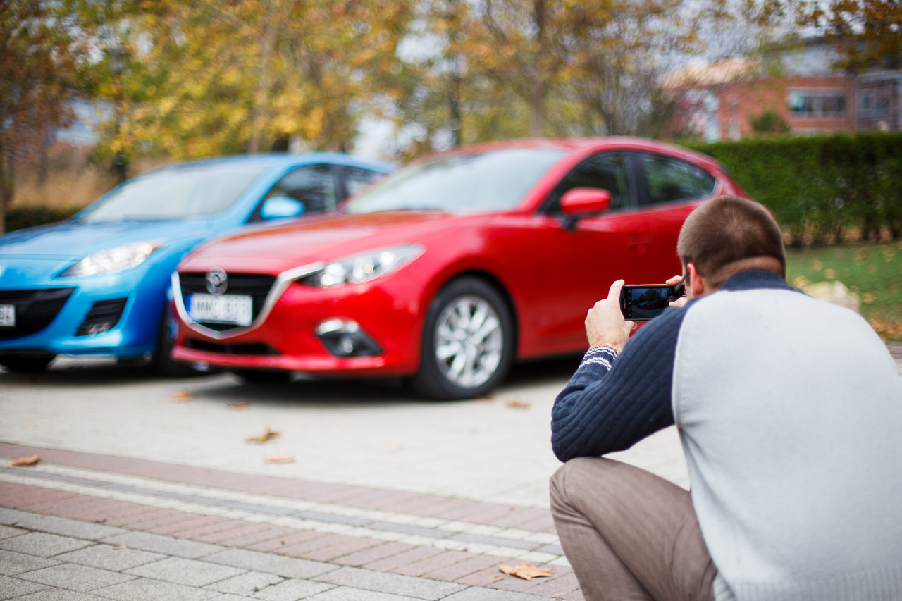 Bevallom, személy szerint is nagyon vártam ezt az autót, s továbbra is nagyon esélyesnek tartom az Év Autója címre, amire valóban van sansza. Mivel dobhatnánk fel a fotózását? E kérdés nem igényelt sok tanakodást, hiszen egyik kollégánk rendelkezik egy elődmodellel, egy 2009-es gyártású, most kifutott verzióval. Bár az övé az alap, 1,6 literes, 105 lóerős és azon motor esetén fullextrás (TX Plus felszereltségű), a tesztautó pedig a jelenlegi motorkínálat második lépcsője, ott pedig a belépő ellátmányú, a két autó mégis illett egymáshoz. Már csak azért is, mert áruk hasonló. Az 1.6-os TX Plus 2009-ben 5 439 900 forint volt, a G120 Challenge most 5 299 900 forint. És ma már kevesebbet is ér a világpiacon ennyi forint, és a mai Mazda3 bizony fényévekkel jobb a réginél. Úgy persze, hogy az sem rossz. Ha először a „régi, valóban 2009-es gyártású, de 2010 őszéig szalonban parkolt autóba ülünk, amiben mindössze 56 ezer kilométer van, egy újszerű és teljesen korrekt autóban érezzük magunkat. És az új? Ez bizony a mai etalon, de ezt majd részletesen a tesztben, most térjünk vissza ezen írás témájához, a fotózási kalandhoz.