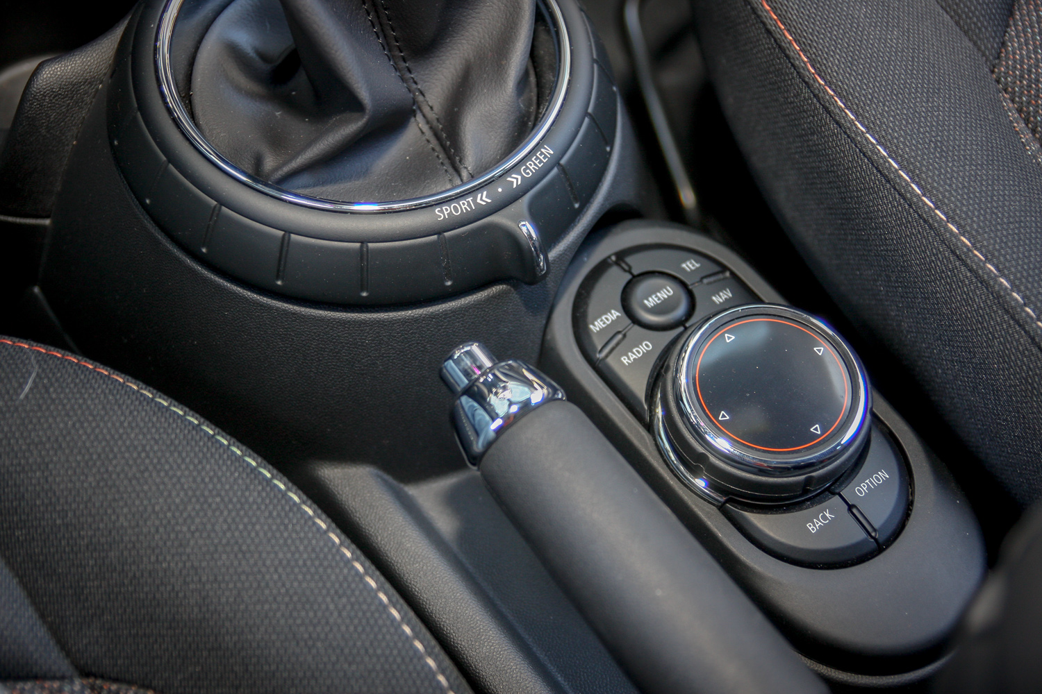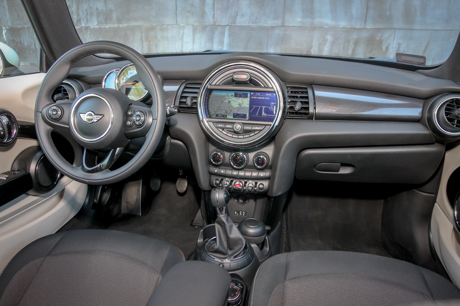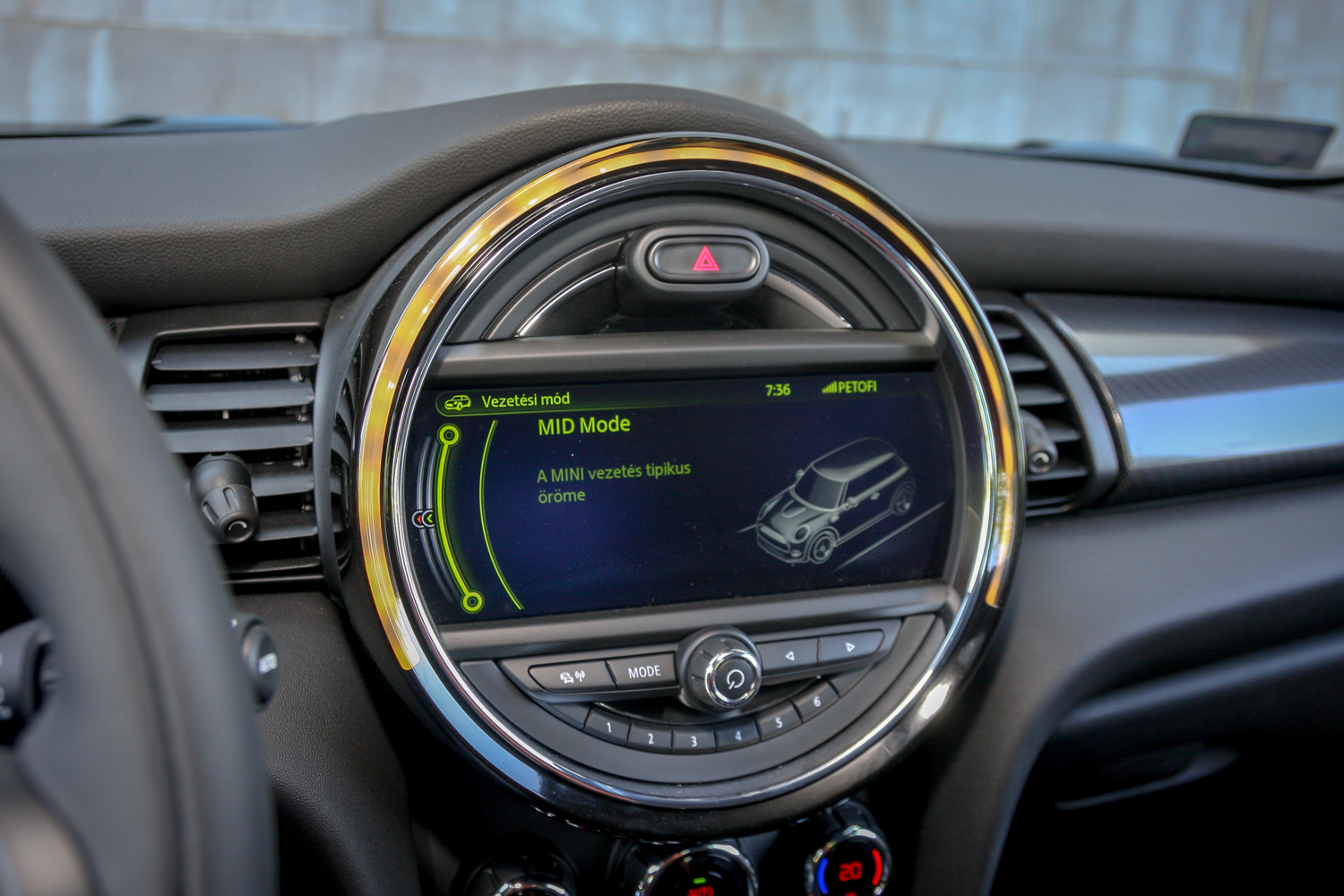 Ahogy odakünn a krómszáj, a nyújtott orr, az átrajzolt, krómkeretes lámpák és a hátul krómcsíkba biggyesztett logó, idebenn – a már említetteken túl még – a piros indítógomb, a BMW-féle írásfelismerős iDrive, a váltó tövében a háromállású élménykapcsoló, a bőségtál karimáján meg az üzemmódtól függő (és KITT-tel egyetemben egyéb szituációkban, pl. parkoláskor is élő és pulzáló) futófény az újdonság. Kissé bazári, de az van, hogy Green, azaz zöld módban értelemszerűen bezöldül a lelkem, s azt írja ki, hogy Fogyasztásoptimalizált vezetés öröme… De váltás Mid módba, középállásba, ahol sárgás háttérrel ezt kapjuk: a MINI vezetés tipikus öröme. Végül Sport mód pirosban: Maximális gokart érzés.
