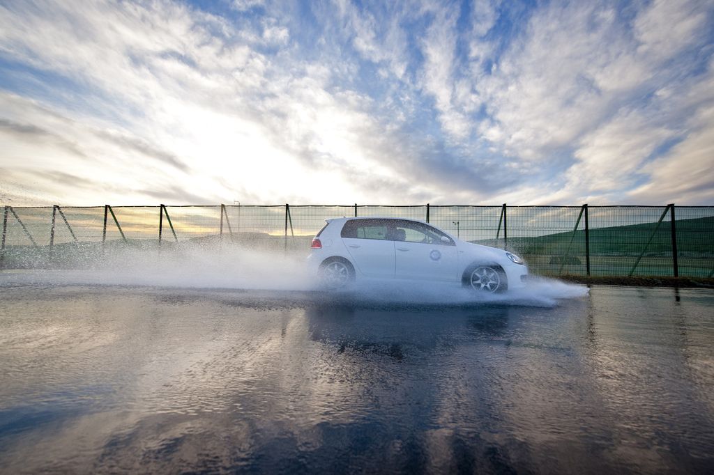 Nedves úton a gumiknak fékútban, aquaplaningban, körpályán és irányíthatóságban kellett bizonyítaniuk. Míg fékezésnél a legjobban a nyári gumi teljesített, addig sok pontot veszített a felúszási (aquaplaning) teszten. Az újrafutózott gumi a szlalomozásban gyors volt, ám elvérzett a kanyarokban, összességében a vártnál gyengébben teljesített. A négyévszakos abroncs egyik próbán sem nyújtott hibátlan csúcsteljesítményt, de átlagos tulajdonságai megbízhatóságról tettek tanúbizonyságot.