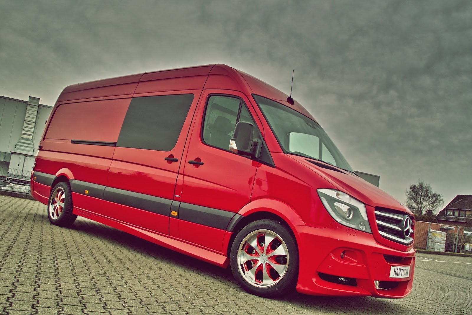 A vásárlók, illetve a nem vásárlók legnagyobb részének az a prekoncepciója, hogy a Mercedes fenntartását és árszintjét nem engedhetik meg maguknak, ezért próbálja a Mercedes teherautóinak luxus imidzsét levetkőzni. Csillaggal 2010-óta árulnak áruszállítót Amerikában, azóta sikerült triplájára emelni az eladásokat; tavaly 21800-ast adtak el belőlük. Ha egy sima Sprinter is kivágta a biztosítékot, akkor mit szólnának vajon ehhez a piros szörnyhöz? Nem tűzoltó, nem is Ferrari, hanem a Hartman tuningverziója. Az optikai átalakításokkor a lökhárítóra és a küszöbökre koncentrálták elsősorban. A felnik 20 colosak, 265/45 méretű gumikkal, így ez a kivitel kevéssé alkalmas munkára.