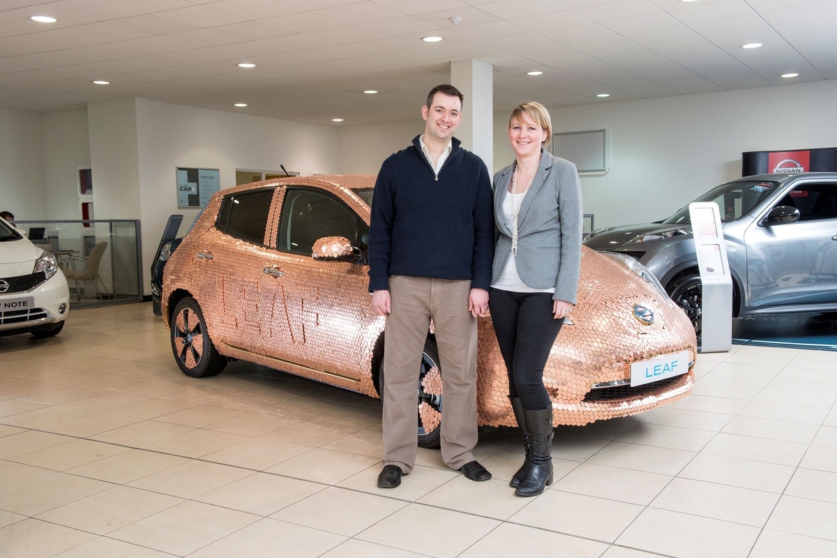 Az érmékkel borított Nissan Leaf egy háromfős csapat egyheti munkájának gyümölcse. Az autó egyik fele pennykkel, másik fele eurócentekkel borított, mindkét oldalra került egy-egy Leaf felirat is, mely három réteg érme felhelyezésével készült. Mivel a különleges borítás tekintélyes, 504 kg-os tömegnövekedéssel jár, ezen példány már sofőr nélkül is túlterheltnek számít. Az érmékkel borított Nissan Leafet a winchesteri Martins Nissan márkakereskedésben állították ki – ott ahol a százezredik Leaf gazdára talált. A vásárló Brett Garner, egy önmagát „technika-őrültként bemutató fogorvos, aki az Anglia déli partján elterülő Fareham városában praktizál.