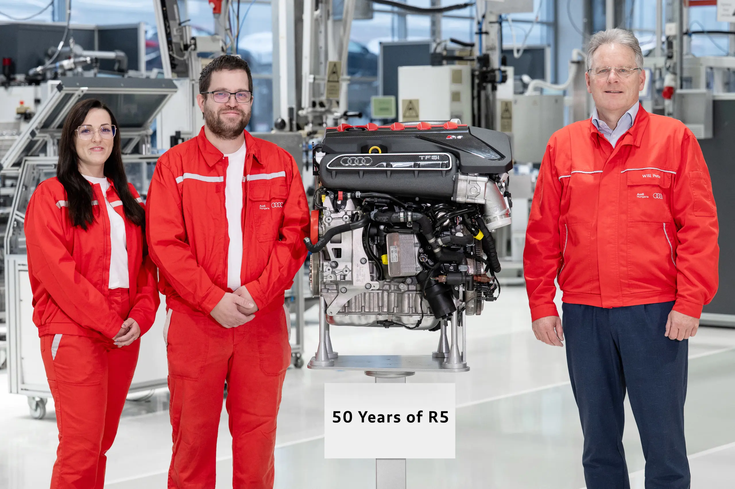 Az Audi Hungaria 2008 óta gyártja a 2,5 literes, öthengeres TFSI-motort, amely az Audi RS 3 szíve, és világszerte rója az utakat. Az erőforrás teljesítménye 390–400 lóerő, a négykarikás vállalat munkatársai eddig több mint 165 000 darabot készítettek belőle. A gyártás a győri motorgyár úgynevezett „Bock”-szerelde keretében történik – teljes egészében kézi munkával, robotok nélkül, magasan képzett szakemberek által. A vállalat szakemberei több mint ezer négyzetméteren, 21 munkaállomáson dolgoznak az öthengeres motor elkészítésén. A fő komponensek – például a hajtórúd és a plazmabevonatos forgattyúsház – szintén Győrben készülnek. A motorgyártás során a legmodernebb technológiák és könnyűszerkezetes megoldások biztosítják a kiemelkedő teljesítményt és hatékonyságot. Az alumínium forgattyúsház, a magnéziummal ötvözött alkatrészek és a plazmabevonatos hengerfalak hozzájárulnak ahhoz, hogy az öthengeres motor ne csak erős, hanem könnyű is legyen. A szakemberek végső minőség-ellenőrzéssel, például hideg- és melegtesztetekkel ellenőrzik a hibátlan működést, mielőtt a motor Ingolstadtba kerül, ahol végs otthonra lel egy Audi RS 3 motorterében. „Büszkék vagyunk arra, hogy az Audi Hungaria gyártja ezt a legendás motort, amely közel öt évtizede az Audi-technológia egyik legfontosabb pillére. Minden egyes motor egyedi darab, amely tükrözi munkatársaink páratlan szakértelmét és elkötelezettségét” – hangsúlyozta Peter Will, az Audi Hungaria motorgyártásért felelős igazgatósági tagja.