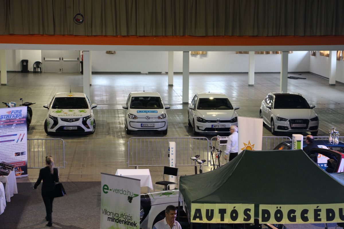 Villanyautó-felhozatal a C csarnokban, hibrideket is rejtettek az emissziómentes autók közé, ezek a csarnokban vezethetők, egyéb modellek a Puskás Ferenc Stadion körül