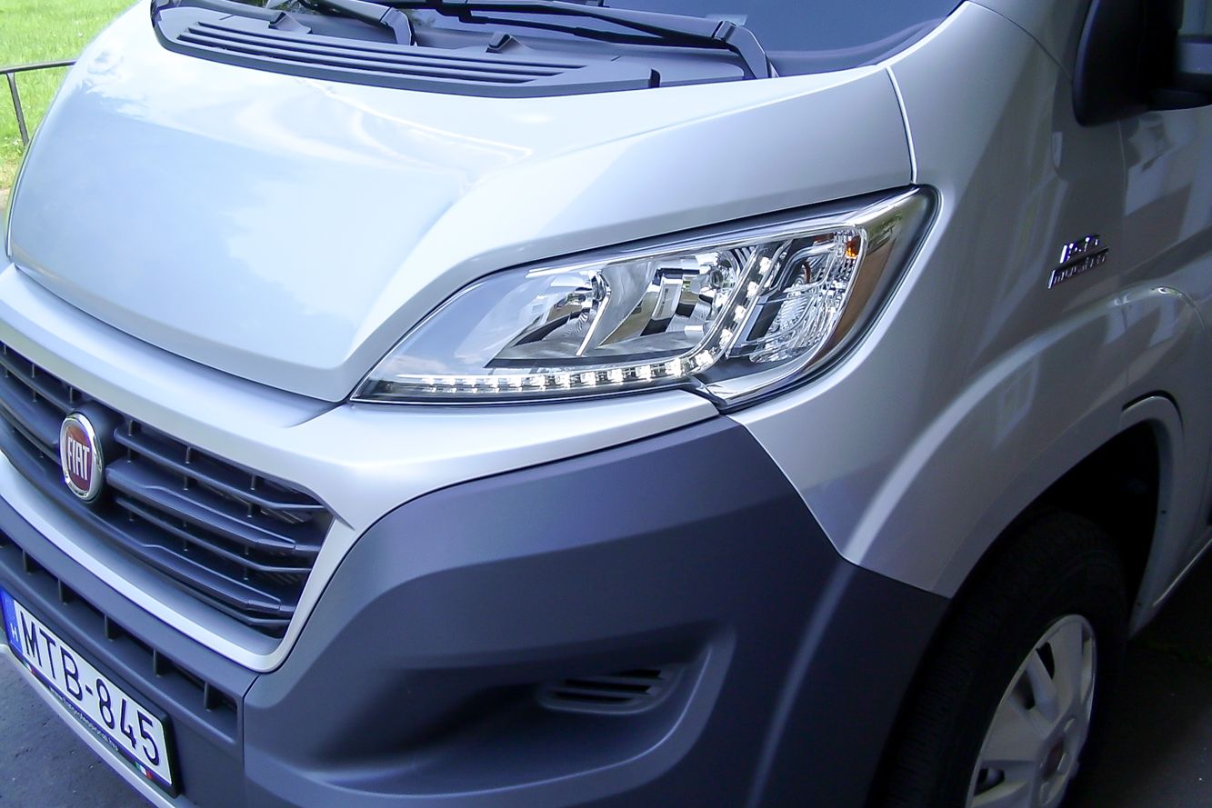 Ahogy a Citroën Jumper és a Peugeot Boxer, úgy a Ducato is megváltozott az idei évre egy kissé. Mindhármon újak a lámpák, amelyek továbbra is jó magasra szereltek, hogy egy koccanáskor kevésbé sérüljenek, de az A-oszlop felé már nincsenek felhúzva. Ez a mosatni talán szebb, kaphat LED-es nappali menetfényt is (88 ezer forint, de a sima izzós alapfelszerelés), ami a három testvéren eltérő rajzolatú hűtőmaszk Fiat változatával jóval komolyabb fellépést ad, mint a korábbi. Ami ennél sokkal fontosabb és többet ér, hogy az első lökhárító három részből áll, így sérüléskor nem kell az egészet kicserélni, hanem lehetőséget ad egy kis legózásra és spórolásra. Ahogy a célelvűen megerősített karosszéria is, ami nagyobb élettartamot és fokozott értéktartást ígér.