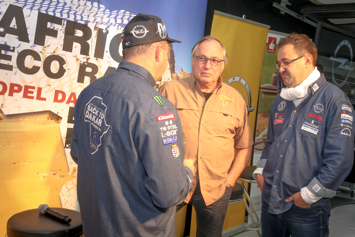 Szalayék 10 éve vágtak először a sivatagnak Opellel, idén kétszer is visszatérnek Afrikába – először októberben a Marokkó-ralin, majd december végén-január elején az Africa Eco Race-en indulnak. A sajtótájékoztatón itt volt az Afrika Eco Race szervezője, a kétszeres Dakar-győztes francia Jean-Louis Schlesser is (középen), aki szerint a következő versenyt a Szalay-Bunkoczi páros fogja megnyerni