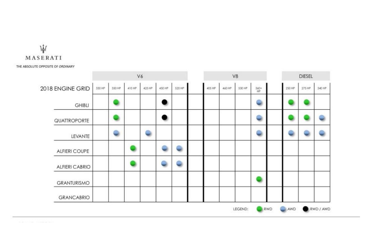 A Ghibli és a Quattroporte 2018-tól 350/450 lóerős V6-os benzinmotorokkal, 250/275 lóerős dízelekkel, hátsó- és összkerékhajtással is kapható lesz, a „több mint 555 lovas V8-as zászlóshajót csakis összkerekesen vásárolhatják majd meg a tehetős ügyfelek. A Quattroportéba érkezik egy 340 lóerős dízel is 4×4-gyel. A Maserati – 2 milliárd eurós fejlesztéssel – 2018-ban már évi 75 ezer autót szeretne eladni, ami ötszörös növekedést jelentene a jelenlegi helyzethez képest.