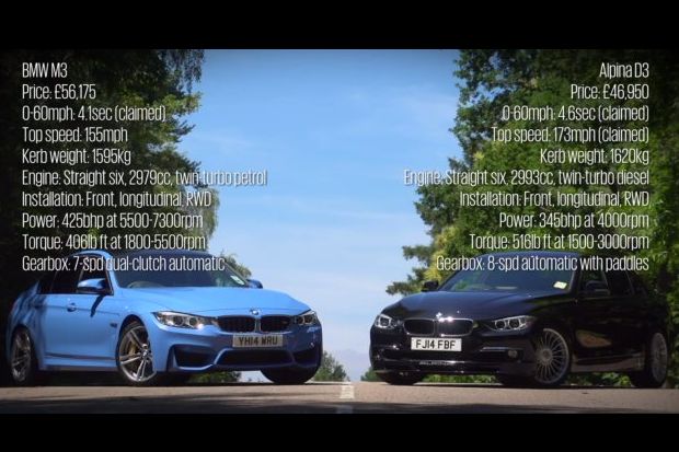 A brit Autocar magazin összevetésében egy új M3 és egy D3 párbajozik, a BMW izomautója „természetesen benzines, az Alpináé dízel. Mindkettő motorja ikerturbós, 3 literes soros 6 hengeres. Előbbi váltója 7 fokozatú kettős tengelykapcsolós automatizált, utóbbié 8 sebességes ZF sportautomata. Az M3 percenkénti 5500-tól 7300-as fordulatig 431 lovas, 1850-től 5500-ig 550 Nm nyomatékú, 100-ra 4,1 mp alatt gyorsul, végsebessége elektronika korlátozta 250 km/óra. Vegyes fogyasztási ígérete 8,3 l/100 km, üres súlya 1635 kg, szériában 18 colos, elöl 255/40-es, hátul 275/40-es kerekeken gurul. Németországi alapára 71 500 euró.