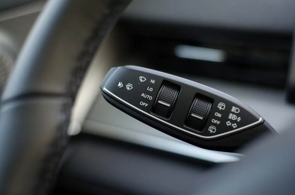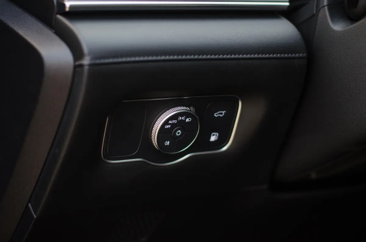 Bár a klímát, illetve rengeteg kényelmi funkciót csak a képernyőről lehet vezérelni, gombok is jutottak bőséggel, kínai mércével mérve meglepően sok is. A plafonon a tetőablak vezérlője, a középkonzolon pedig a vezetési módok, illetve a hajtáslánc üzemmódválasztója kapott fizikai kezelőszerveket néhány gyorsgombbal, a kormánytól balra pedig valódi lámpakapcsolóval kedveskedtek, ami már a jól bejáratott márkáknál sem egyértelmű manapság. Persze, ezek a gombok és tekerők is érezhetően csak a számítógépnek küldenek jeleket, a multifunkciós kormány olcsóbb megoldása miatt pedig a szokásosnál jóval könnyebb mellényomni rajta. Így a kapcsolóknak nincs minőségi érzete, de még ez is ezerszer jobb, mint a tapipadok, vagy a menüben turkálás.