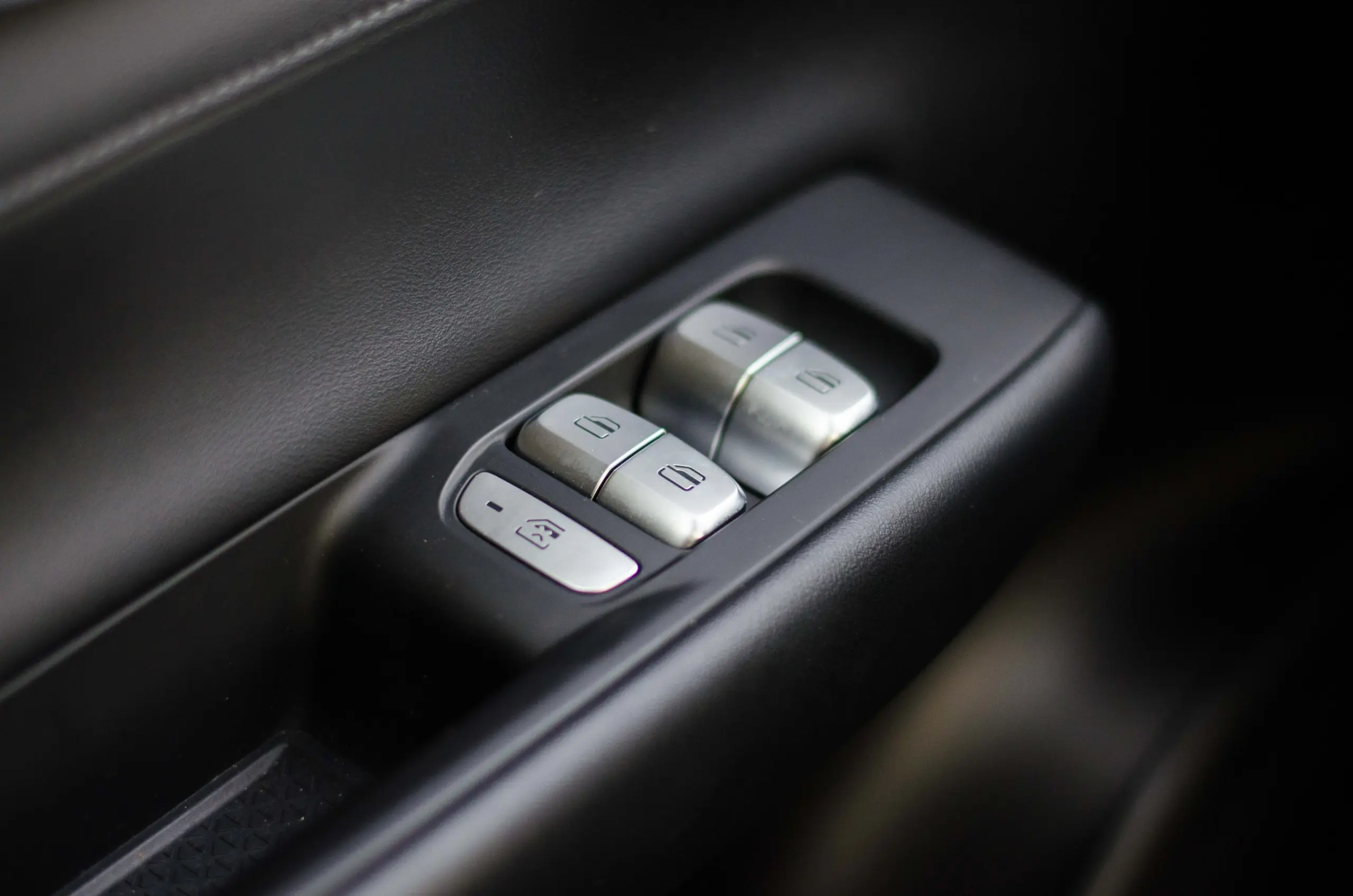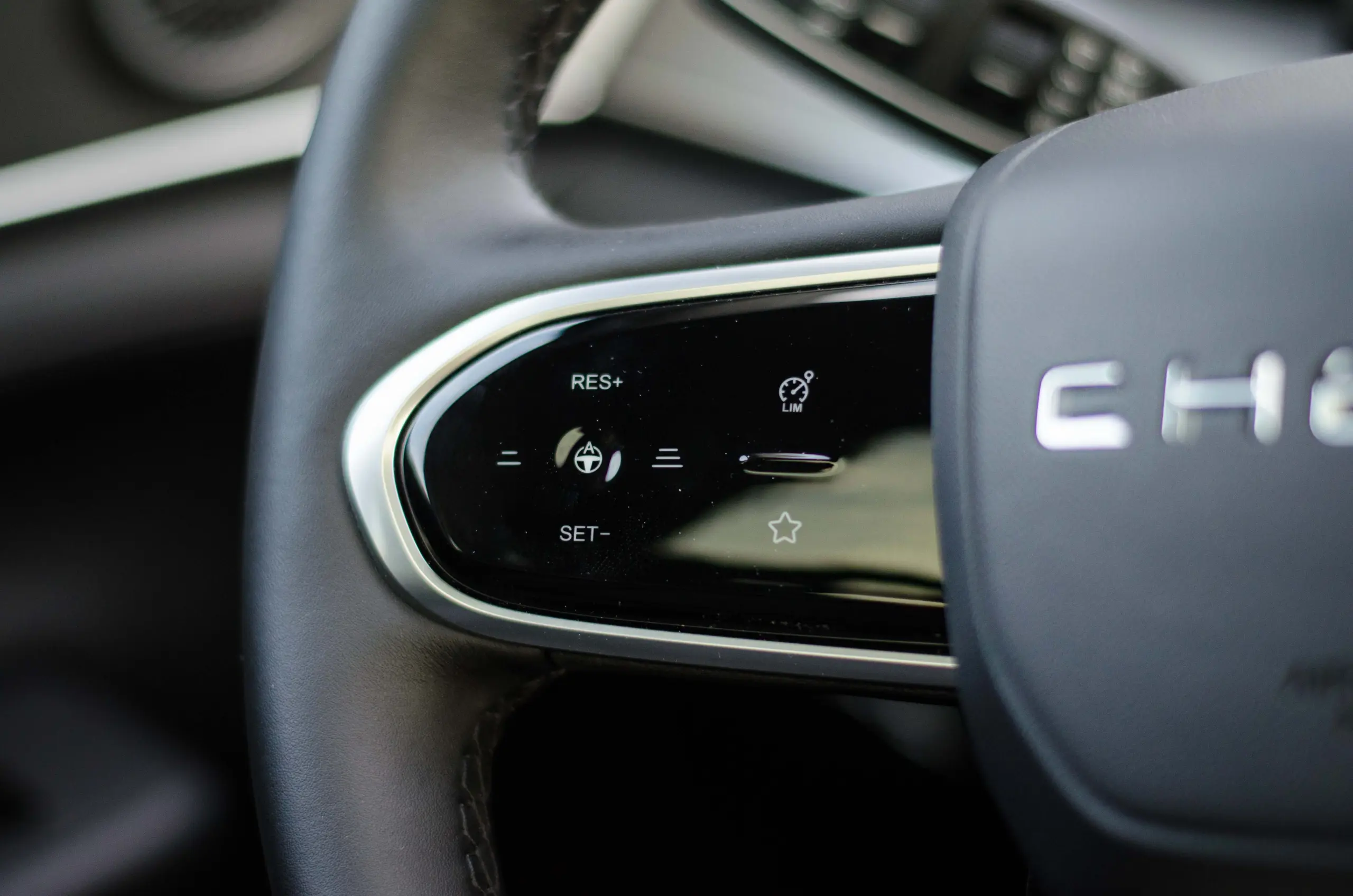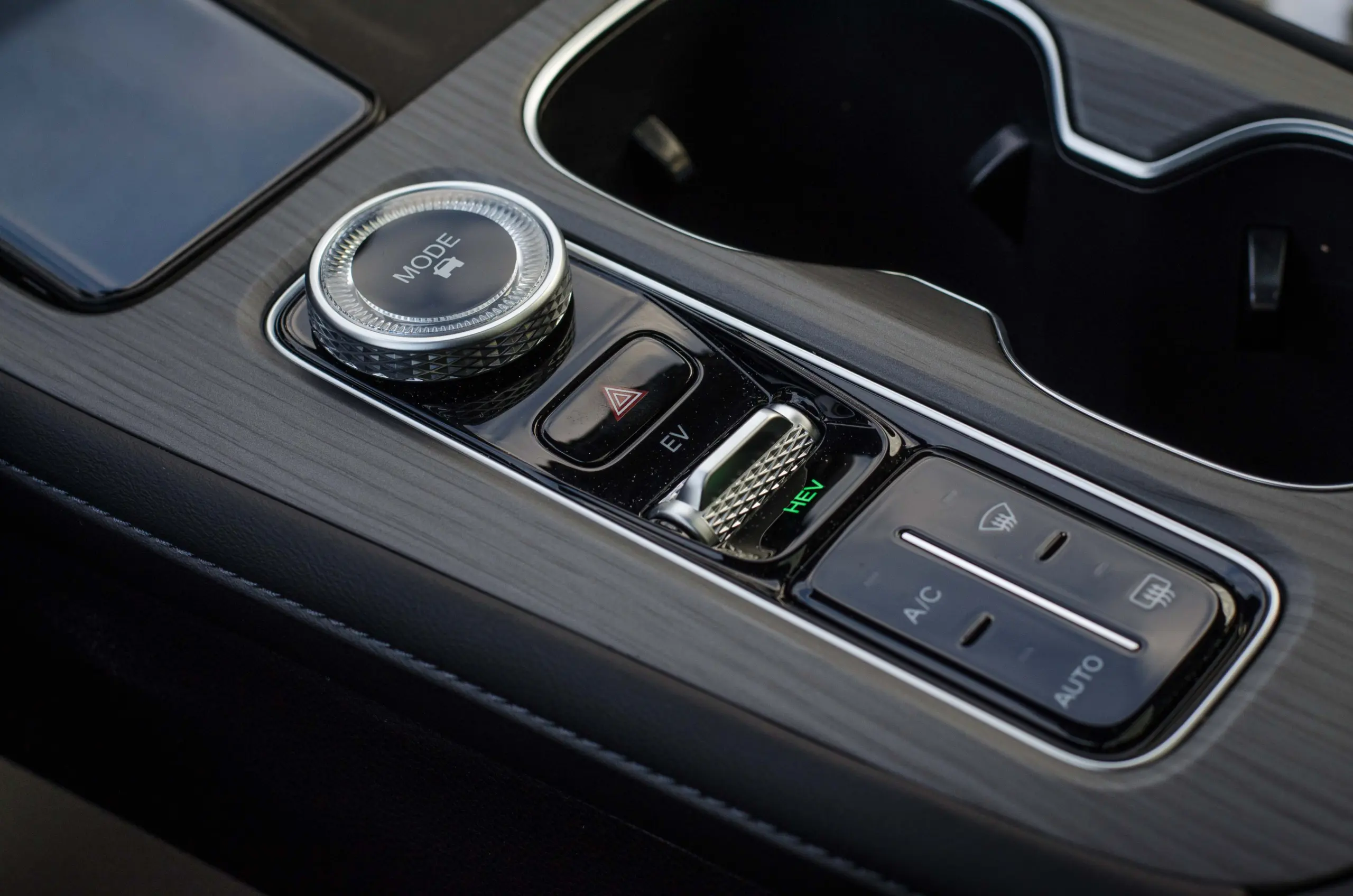 Bár a klímát, illetve rengeteg kényelmi funkciót csak a képernyőről lehet vezérelni, gombok is jutottak bőséggel, kínai mércével mérve meglepően sok is. A plafonon a tetőablak vezérlője, a középkonzolon pedig a vezetési módok, illetve a hajtáslánc üzemmódválasztója kapott fizikai kezelőszerveket néhány gyorsgombbal, a kormánytól balra pedig valódi lámpakapcsolóval kedveskedtek, ami már a jól bejáratott márkáknál sem egyértelmű manapság. Persze, ezek a gombok és tekerők is érezhetően csak a számítógépnek küldenek jeleket, a multifunkciós kormány olcsóbb megoldása miatt pedig a szokásosnál jóval könnyebb mellényomni rajta. Így a kapcsolóknak nincs minőségi érzete, de még ez is ezerszer jobb, mint a tapipadok, vagy a menüben turkálás.
