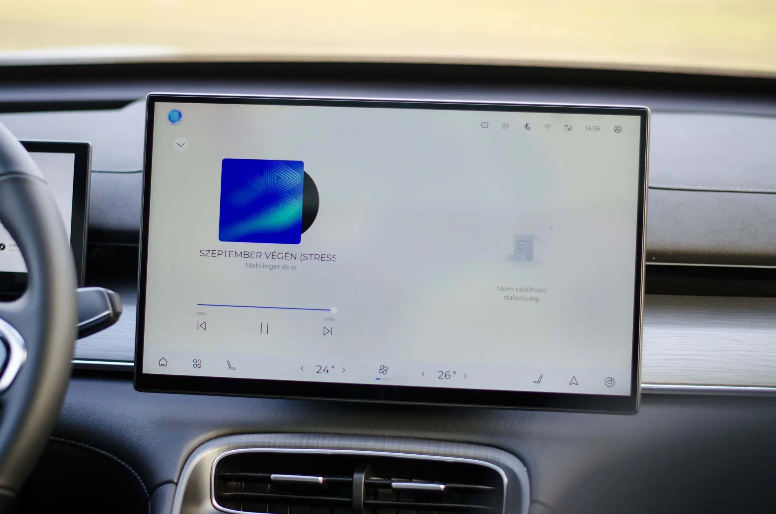 A 10,25 colos digitális műszeregység, illetve a 15,6 colos infotainment érintőkijelző nem csak méret, hanem felbontás terén is tudja a kategória elvárt színvonalát, illetve a rendszer is könnyen és érthetően kezelhető. A fényerőből, a színek minőségéből, a háttérvilágítás egyenetlenségeiből, illetve az éles napfényben nyújtott teljesítményből azonban egyértelműen kiderül, hogy olcsó panelekről van szó, ezen a tükröződésre hajlamos felület sem segít. A grafikák és a digitális dizájn terén sem kell problémát keresni, hiszen nincsenek. Mármint grafikák, az egész felhasználói felület a lehető legalapabb, legegyszerűbb, hatalmas üres terekkel. Ez viszont csak esztétika, illetve minimális kellemetlenség bizonyos időjárási körülmények között. Maga az érintésérzékeny felület viszont mindenkit zavarni fog, aki kezelt már minőségi érintőképernyőt: pontatlan, gyakran nem érzékeli az ember ujját, tartós odanézés nélkül nehéz kezelni, ami eleinte még alig tűnt fel, másfél hét után azonban egyenesen zavaróvá vált számomra. Ez az első részlet, ahol hajlandó lennék többet fizetni: egy jobb képernyő igenis megérné a felárát, ha lenne ilyen opció. De az sem kizárt, hogy csak elkényeztettek a drágább panelek.
