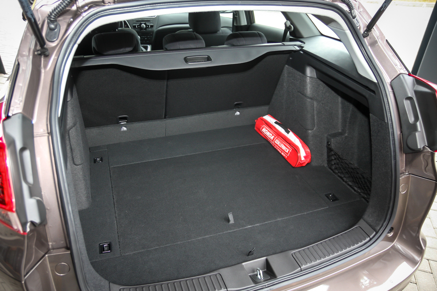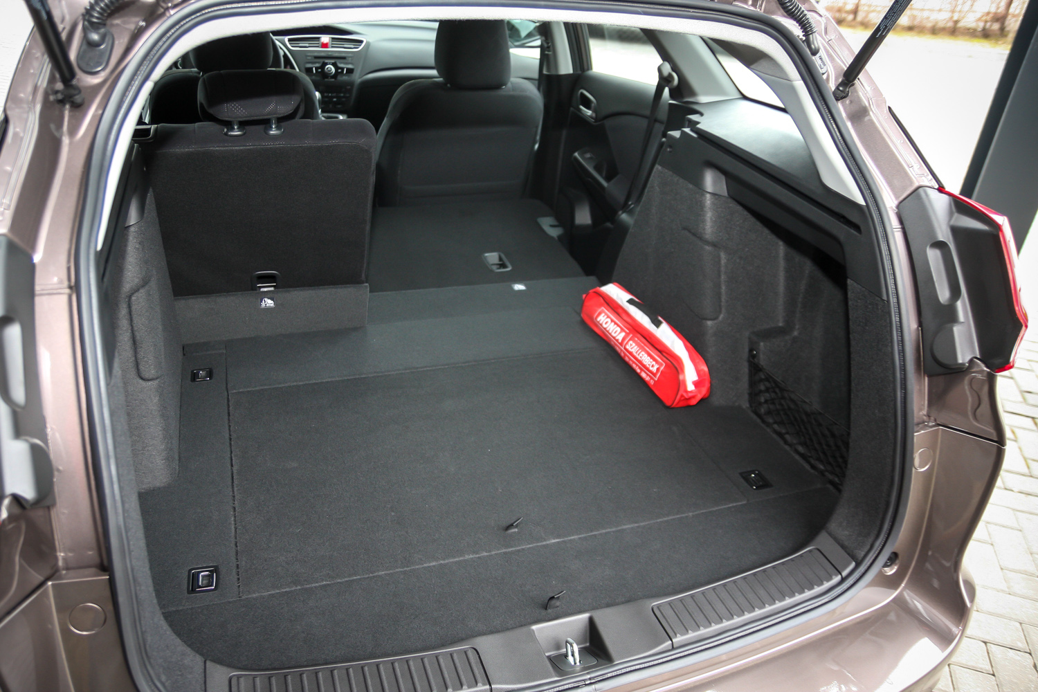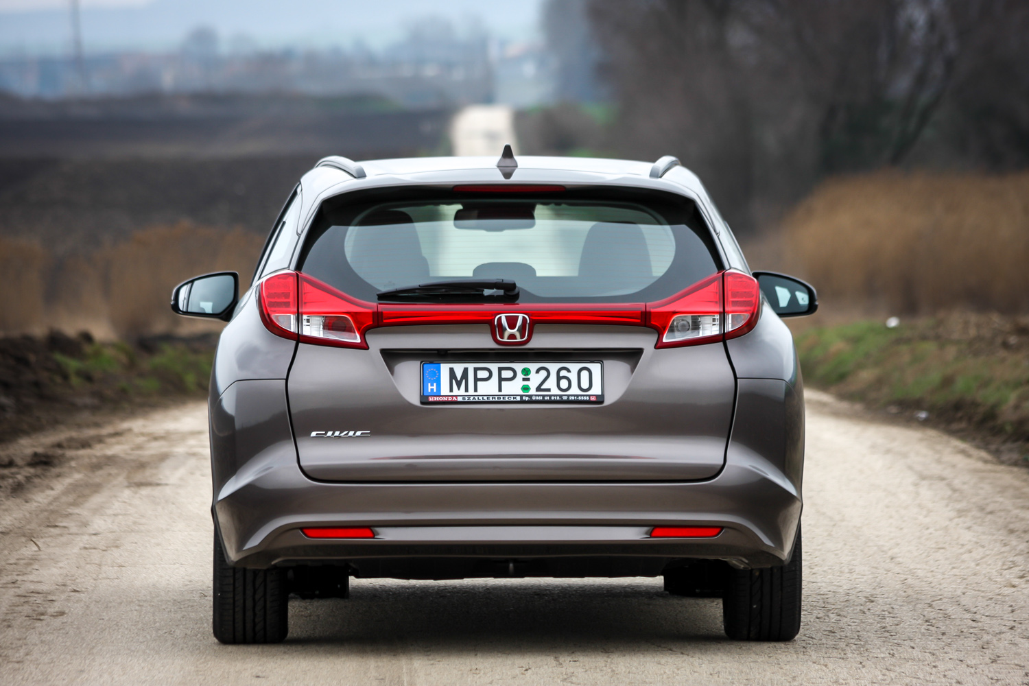 A hátsó kilincs itt is „rejtett, a kerékjáratok fekete műanyagozása divatosan terepes látszatot kelt. Rafinált megoldás a hátsó oldalablaké, ahogy rányúlik a D-oszlopra. Az európai igényeket figyelembe véve Európában tervezett és fejlesztett, Európában, közelebbről Angliában gyártott Civic Tourer 4,53 méteres hosszával ma már nem számít olyan hű, de nagynak, ennek fényében szép a rekordméretű raktér