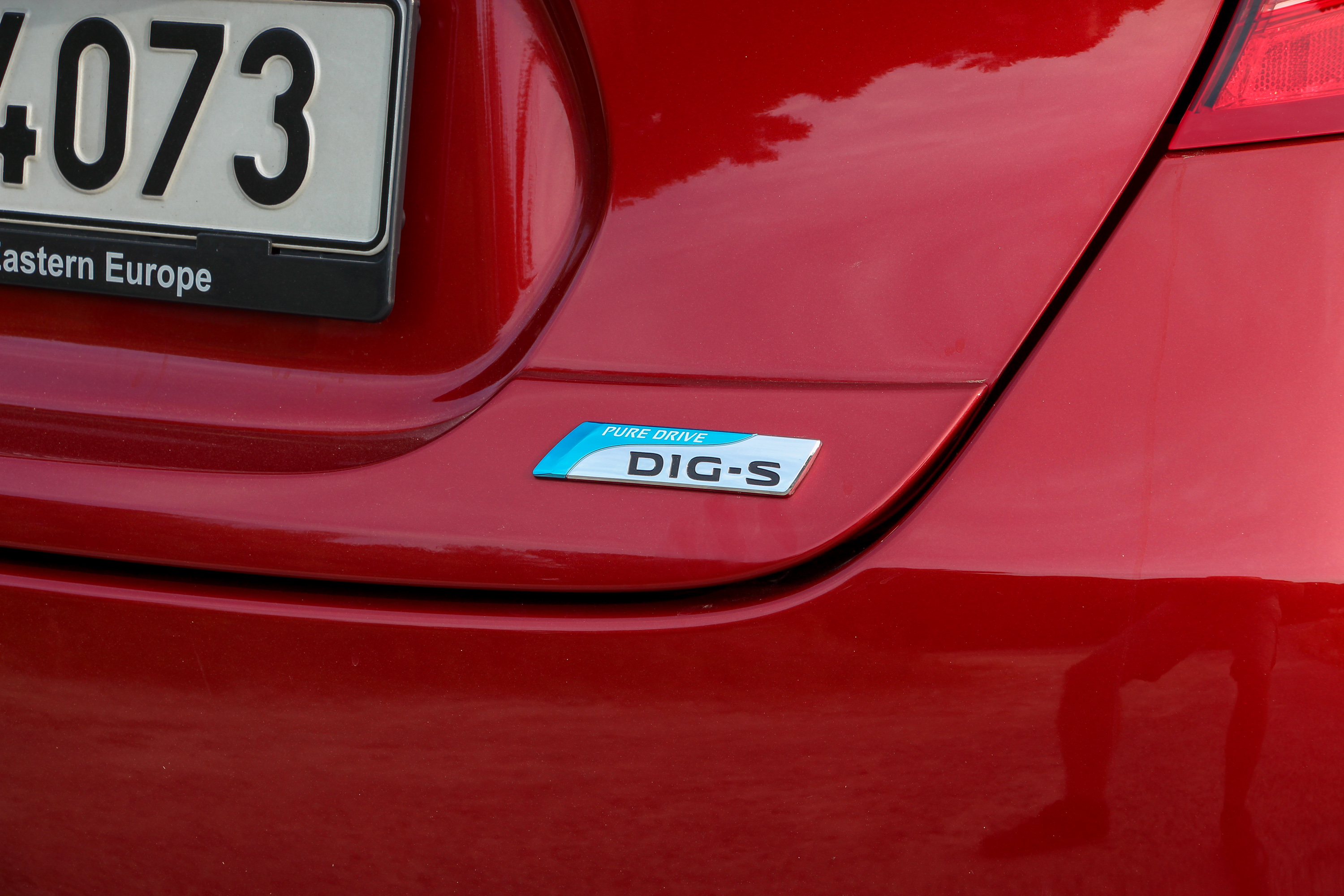 Menet közben az lehet zavaró, hogy rossz úton a nagy kerekek akkora lengéseket adnak át az elöl MacPherson, hátul csatolt hosszlengőkaros futóműnek, hogy azt nem csak hallani, de már a kormányon is érezni lehet. A kompresszoros háromhengeressel nem rossz autópályázni, de ilyenkor természetesen nagyon megnő a relatíve nagy tükrök keltette szélzaj. 130-nál ötösben 3250-et forog a motor, a beltérben mért zaj 71 decibel. Ha nem sietünk, akkor érdemesebb visszafogni magunkat és a 120-ra beállni, akkor kereken 3000-et forog a kis kompresszoros motor, felesleges erőltetni. A hangja nagyon vicces tud lenni, egyesben és kettesben kiforgatva a jó öreg wartburgos, igazi háromhengeres szívóhang hallható, azt speciel én nagyon szeretem. Alapjáraton viszont olyan, mint a szomszéd szobában működő csapágyas kávédaráló, nem igazán meggyőző – még jó, hogy a stop-start miatt nem sokat kell hallgatni. A városi ötvennél négyesben 1500-ast forog a főtengely, innen visszaváltás nélkül nem a legjobb gyorsítani, 147 Nm nyomatékát elég magasan, csak 4400-nál adja le. Mindezek ellenére egy erős vegyes teszthét után sem ment 6,0 liter fölé a fogyasztás, ami nem rossz. Egészen addig, amíg a jobban vezethető, igaz a DIG-S-nél papíron 8 lóerővel gyengébb jó kis 1.5-ös és négyhengeres Renault dCi motoros dízelről nem tudjuk, hogy csak 300 ezerrel drágább és 4,5-öt fogyaszt. Aki fölényesen, nyomatékból gyorsítva szeretne országúton közlekedni a Note-tal, az ezt vegye. Aki viszont mindenképpen a kulturált benzinest szeretné, annak én a szívó 1.2-est ajánlanám 80 lóerővel és 400 ezerrel olcsóbban.