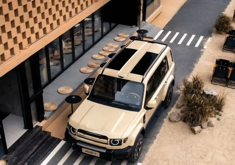 íváncsiak leszünk, mit szól majd a Land Rover, mivel az autó finoman szólva is kísértetiesen hasonlít az éppen aktuális Defenderre. Klasszikus szögletes, off-road SUV dizájn, kerek fényszórókkal, hagyományos kilincsekkel, függőlegesen elrendezett hátsó lámpákkal, kívülre helyezett pótkerékkel, oldalra nyíló csomagtér ajtóval és a jól megszokott fényezetlen műanyag betéteket is megtaláljuk körben az autón. A leendő vásárlók ötféle fényezés között válogathatnak: kék, sárga, ezüst, bézs és az elmaradhatatlan fekete.