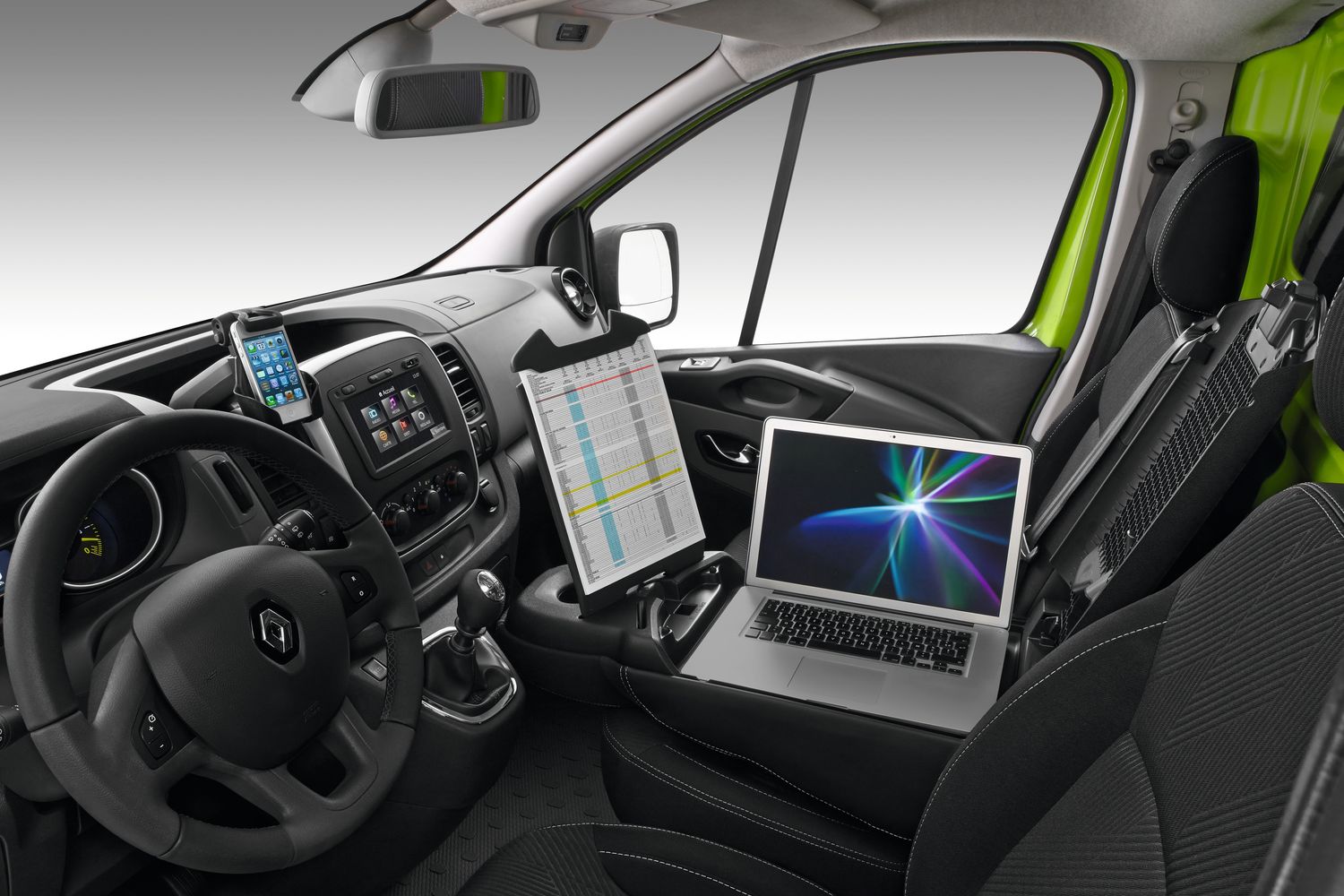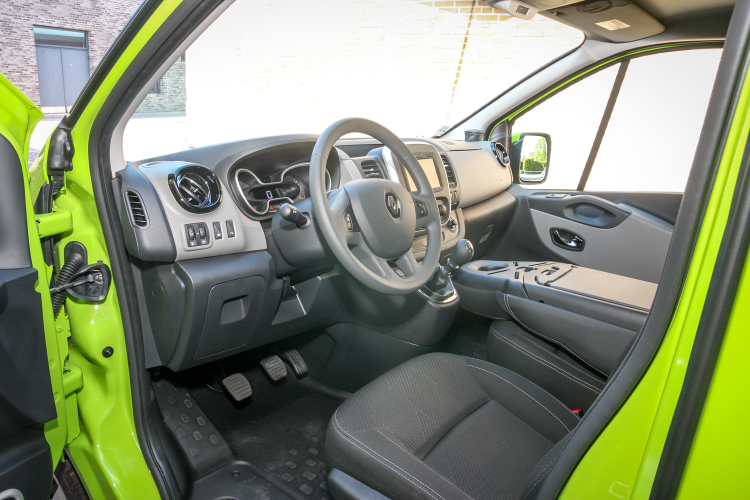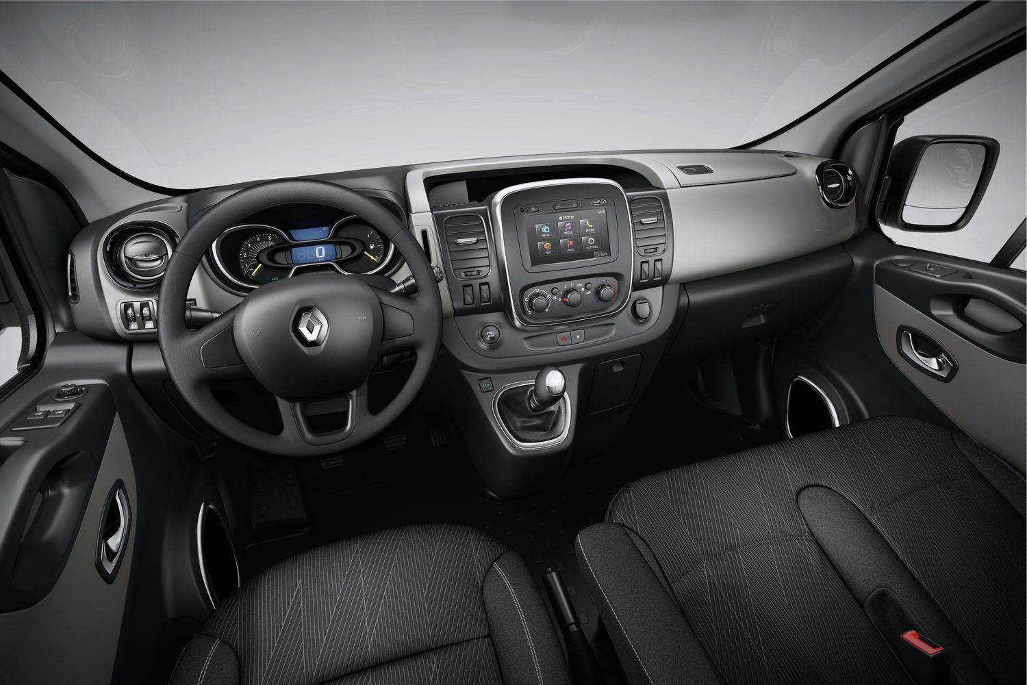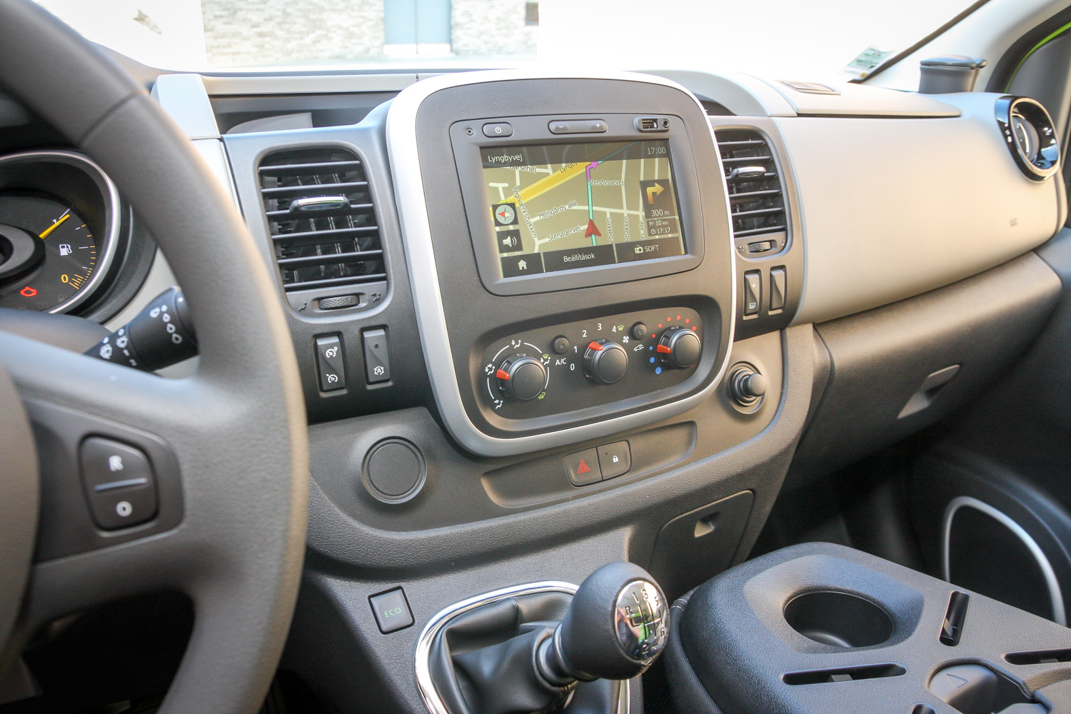A természetesen továbbra is kétféle tengelytávú és magasságú karosszériával, összesen 270 változatban rendelhető Trafic közben szódával, de inkább okostelefonnal/max. 17 colos laptoppal/tablettel és A4-es iratokkal mobil irodának is elmegy – mindennek van helye, R&GO multimédiás dokkolója USB-csatlakozóval és Bluetooth-szal, modern, ergonomikus, szuper. És 14 ilyen-olyan rekeszbe 90 liternyi cuccot rámolhatunk szerte a 2-3 személyes fülkében. A kormány tengelyirányban is állítható, van, opciósan lehet a fedélzeten a márka személyautóiból ismert érintőképernyős MediaNav és R-Link, kulcs nélküli nyitás/indítás, tolatóradar és tolatókamera is.