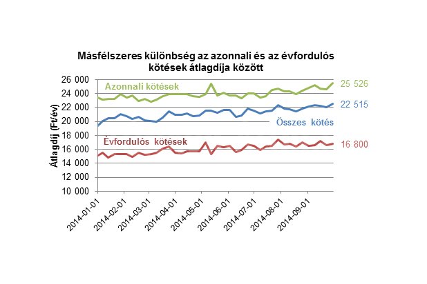 Továbbra is átlagosan másfélszeres díjon kötnek kötelezőt a vásárlás után szerződők (azonnali kötések), mint azok, akik a szerződésük évfordulóján döntenek arról, maradnak-e jelenlegi biztosítójuknál, vagy máshová szerződnek. Míg az előbbiek átlagdíja szeptember végén 25 000 forint volt, az utóbbiak 16 800 forintos éves díj mellett kötöttek szerződést.