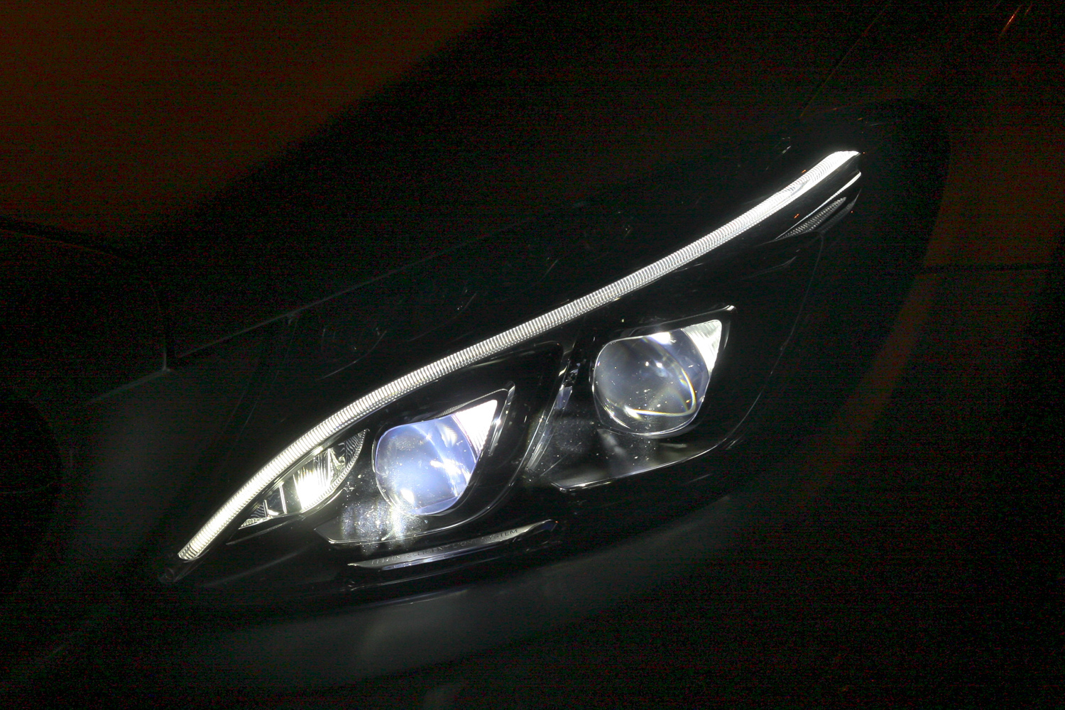 Sötétben meg az egész kocsi egy lenyűgöző fényjáték. Ahogy kinyitod, elképesztő fényorgiával válaszol. A LED-es DRL kékesen kezd, s megy át vakító fehérbe, a hátsó piroskát a mesebeli farkas sosem kapta volna be, de a kilincsek tájékáról, a tükrök és az ajtók aljáról szórt környezet-megvilágítás is pazar. Plusz az utastér is már-már zavarba ejtő fényárban tud úszni. Az egész fényfeneség ereje és színe is változtatható, naná.