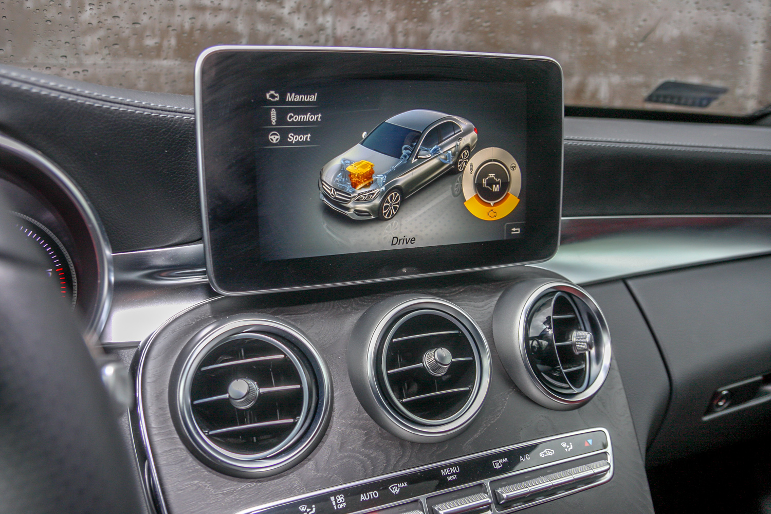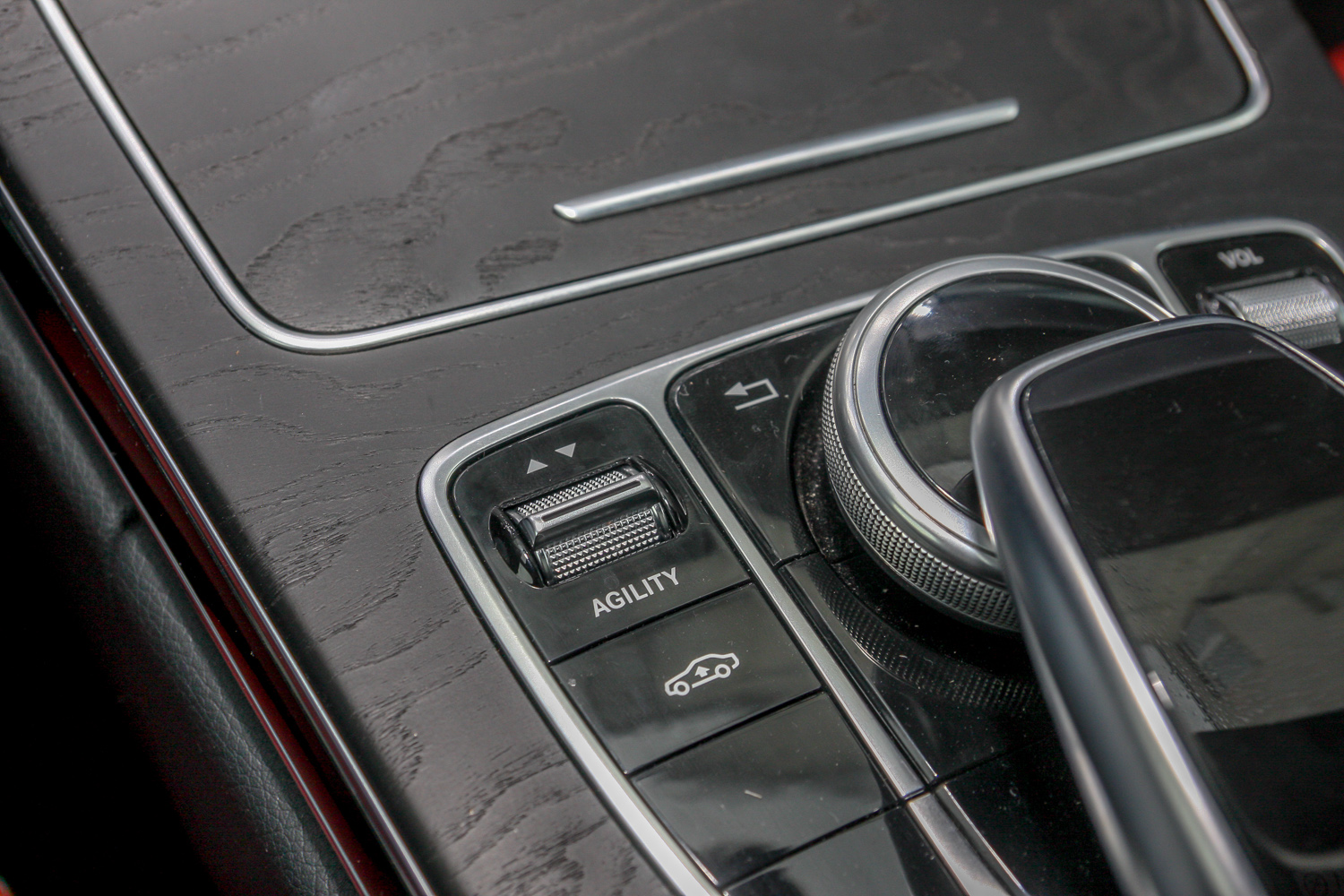 Aminek a bal oldalán üzemmód-választó és még egy érdekesség figyel. Előbbivel takarékostól a sportosig paraméterezhető a gázreakció, a futómű, illetve a kormány (és nagyon is érezhető a különbség például a Comfort és a Sport+ között), utóbbival megemelhető a kocsi hasa, ami hasznos lehet mélygarázsos parkolásnál. Mert bizony légrugó is van, aminek hála – Comfort módban – pazar a hátul ötlengőkaros felfüggesztésű C rugózási komfortja.