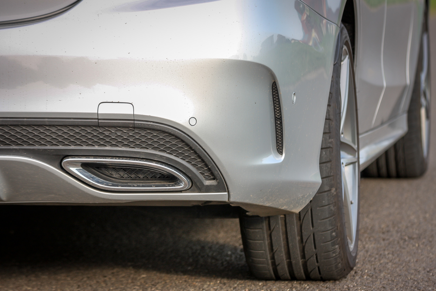 Két ponton azért veszem a bátorságot, és csak belekötök a külsőbe: szerintem az AMG-s lökhárító fényes műanyag legalsó része bazári, és – nekem legalábbis – az szintén gáz, hogy a diffúzoros hátsó fertály dupla kipufogóvége holmi dísz, nem más. Az egyke bal oldali cső a kötény takarásában szomorúan biggyed lefele, na mindegy. Az utca népét úgyis elvarázsolja a csillag és az elegáns LED-es nappali menetfény.