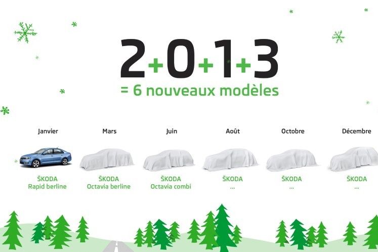 Rapid, Octavia, Octavia kombi, Octavia RS – mind-mind új modell, plusz – valószínűleg – Superb és Yeti facelift – így fest a feltörekvő Skoda 2013-as bővítő és frissítő, összesen tehát 6 újdonságot soroló menetrendje. A csehek nem szerény idei programját valamiért a francia márkaimportőr osztotta meg a legnépszerűbb közösségi oldalon.