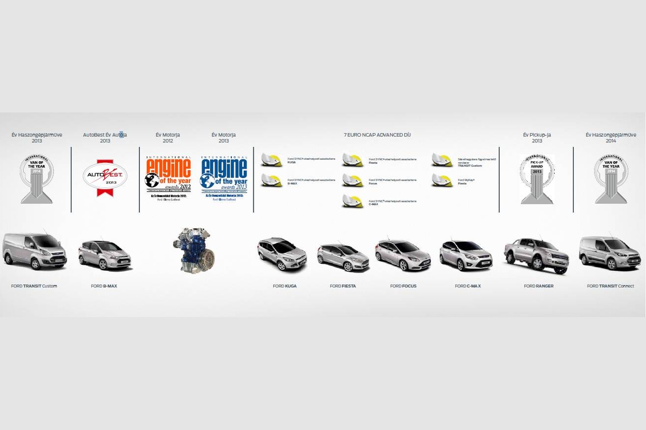 A Ford megítélésben nagy szerepet játszik a modellpaletta, valamint a vállalat által az elmúlt két évben bemutatott forradalmi technológiák, aktív biztonsági és vezetéstámogató rendszerek egész sora. A Fordnak ítélt kiemelkedő nemzetközi szakmai elismerések között említhető az aktív biztonsági rendszerek révén szerzett 7 Euro NCAP Advanced díjon felül a 2012-es és 2013-as ’Év Motorja’ díj az 1.0 EcoBoost motor, a 2013-as ’Év Haszongépjárműve’ díj a Transit Custom, a 2014-es ’Év Haszongépjárműve’ díj a Transit Connect, a 2013-as ’Év Pickupja’ díj a Ranger, valamint az AUTOBEST 2013 díj a B-Max révén.