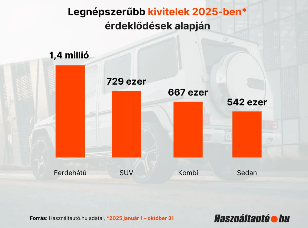 A ferdehátú karosszériával készült autók továbbra is változatlanul a legnépszerűbb kategóriát jelentik a használtautó-piacon: 2025-ben eddig gyakorlatilag ugyanannyi érdeklődés volt irántuk, mint az előző év azonos időszakában. Az adatok szerint 2024-ben 1,394 millió, míg 2025-ben 1,398 millió érdeklődés érkezett erre a típusra, ami mindössze 0,3%-os növekedést jelent. A stagnáló kereslet mellett azonban az árak egyértelmű emelkedést mutatnak: az átlagár 2,44 millió forintról 2,60 millió forintra nőtt, ami 6,5%-os drágulást jelent. Az átlagéletkor 14,65-ről 14,85 évre emelkedett.