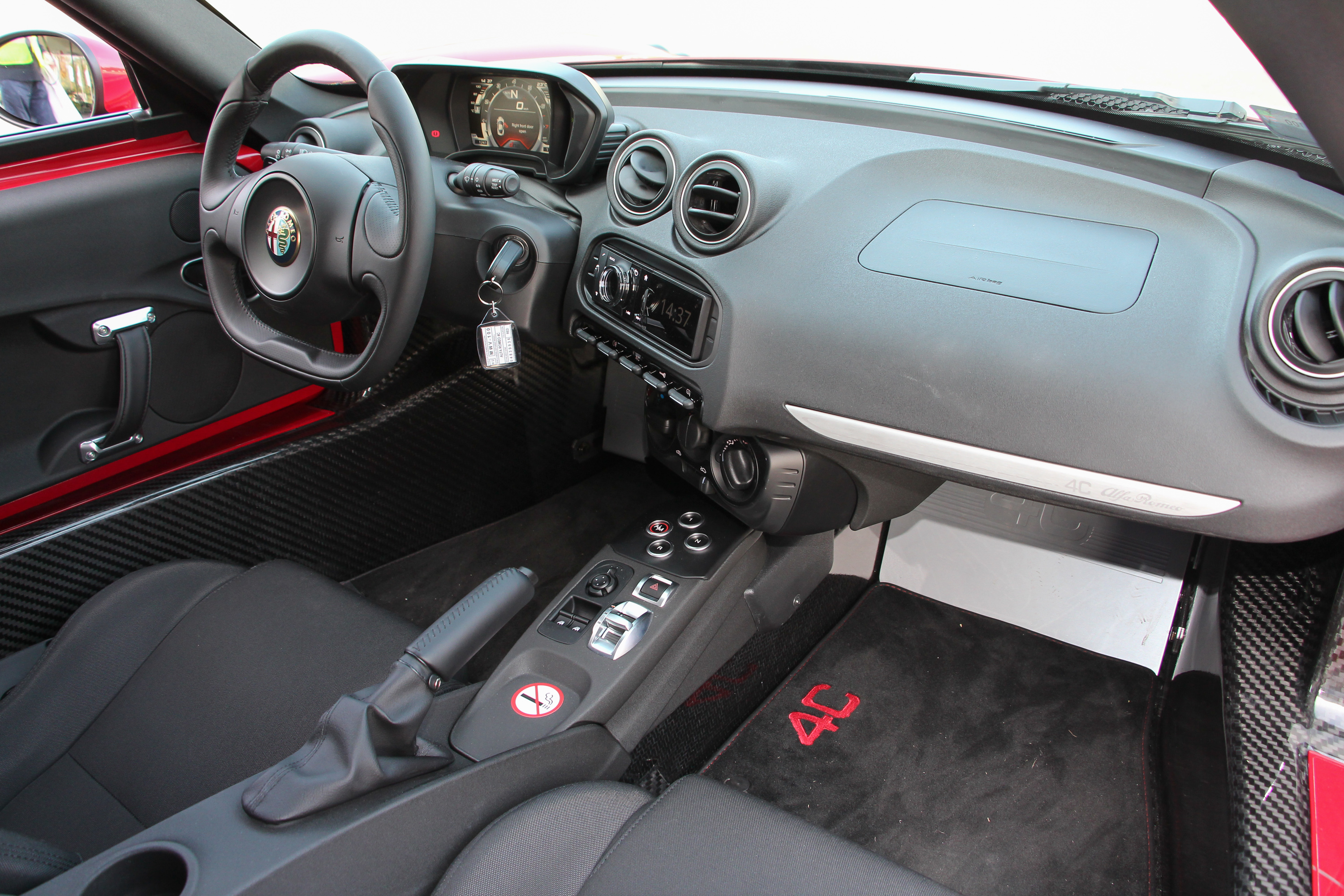 A 4C motorjáról nem csak azt kell tudni, hogy az utastér mögé, a hátsó tengely elé kerül, s ad szinte tökéletes tömegeloszlást, a középmotor mindössze 1,75 literes, a Giulietta Quadrifoglio Verde csúcsváltozatában is dolgozó turbós, közvetlen befecskendezésű, folyamatosan változó szívó- és kipufogószelep vezérlésű, optimalizált örvénylésű benzines. 240 lóerővel és alacsonyan ébredő 350 Nm nyomatékkal. De talán nem is ez a lényeg, hanem a hangja (amiből valamicskét mutat a fenti felvétel, ám nem azt, amit bent, menet közben hallunk), illetve az, hogy a 6 sebességes száraz duplakuplungos, a kormánykerék mögül is kapcsolható váltó elektronikusan vezérelt önzáró differenciálművön keresztül hajt. A 4C-t nem is mosolyt, vigyort fakasztó élmény vezetni. A közvetlenség érdekében kormányműve szervo nélküli, igaz, talán jobb lenne egy hangyányit szűkebb áttételű, a parkoláskori tekerhetőséghez nyilván már rásegítést igénylő kormánymű.