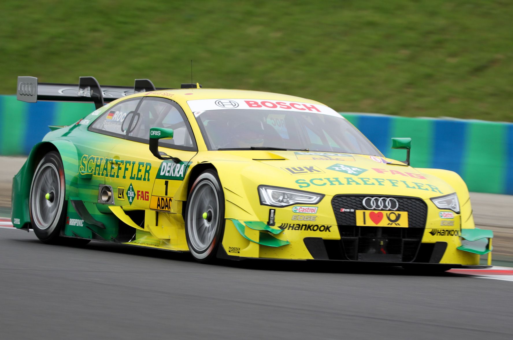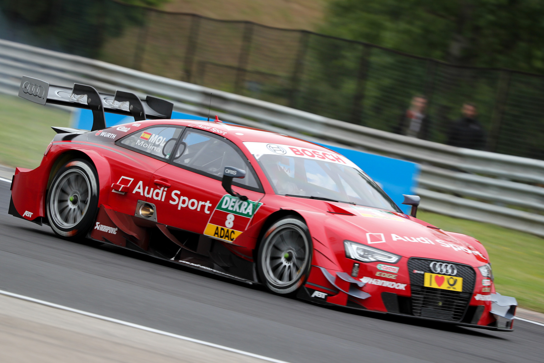 A legnagyobb kunszt az, hogy a BMW jóvoltából bemehetünk körbenézni a BMW Team MTEK boxjába. Két versenyzőjük közül a 22 éves portugál António Félix da Costa olyan jó fej, hogy ha már arrafelé bóklászik, vezetőnktől átvéve a mikrofont mond pár szót az autókról. Ő is a nyitott formaautók világából érkezett, ezért otthonosan érzi magát a BMW M4 DTM-ben. Mert hiába hasonlít formája az utcai kocsikéhoz, hiába van baloldalt a kormány és a vezetőülés, ez valójában egy nagyon profi célgép. Alig csereszabatos pár alkatrésze az utcai autókéval. Egy karbonszálas monocoque a lelke, ami egyszerre teherviselő elem és bukókeret is.