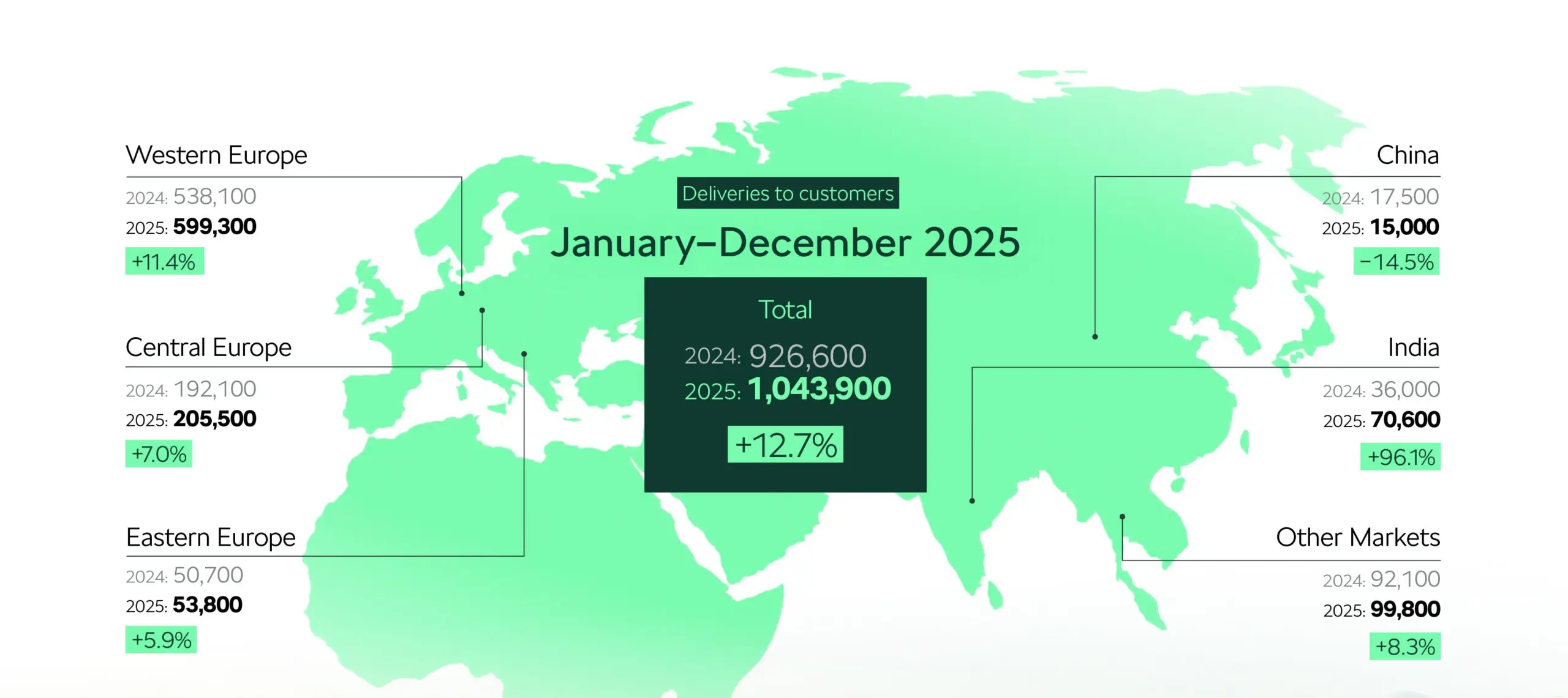 1 043 900 gépjárművet szállított le 2025-ben a Škoda, ezzel 12,7 százalékkal túlszárnyalták 2024-es eredményüket, illetve 2020 óta ez volt a cseh vállalat legjobb éve. Nem meglepő módon Európában értékesítették a legtöbb autót (836 200 db), ezzel pedig a kontinensen a harmadik legtöbb személyautót gyártották le. A márka a villanyosított autók szegmensében is nagyot lépet előre, főként az Elroq megjelenésének köszönhetően. Összesen 174 900 tisztán elektromos Škoda talált gazdára, csaknem 120 százalékkal több, mint 2024-ben, de konnektoros hibridekből is 108,6 százalékkal többet szállítottak le.