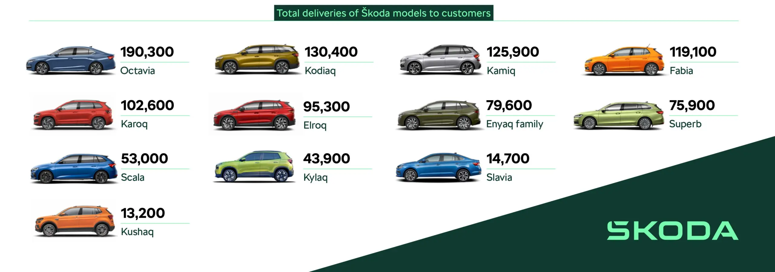 2025-ben is az Octaviából szállította le a legtöbbet a Škoda, több mint 190 ezret, ezt követően a Kodiaq következik 130 400 példánnyal. A dobogó alsó fokán a Kamiq közel 126 ezer példánnyal, majd az első ötöt a Fabia és a Karoq egészíti ki. A két villanyos modell – az Elroq és az Enyaq – a 6. és 7. helyre fért oda. Az Európában forgalmazott modellek ranglistáját a Superb és a Scala zárják. A nálunk nem kapható modellek közül a Kylaq típusból fogyott a legtöbb (43 900 db), míg a Slava és Kushaq modellekből kevesebb mint 15 ezer kulcsait adták át.