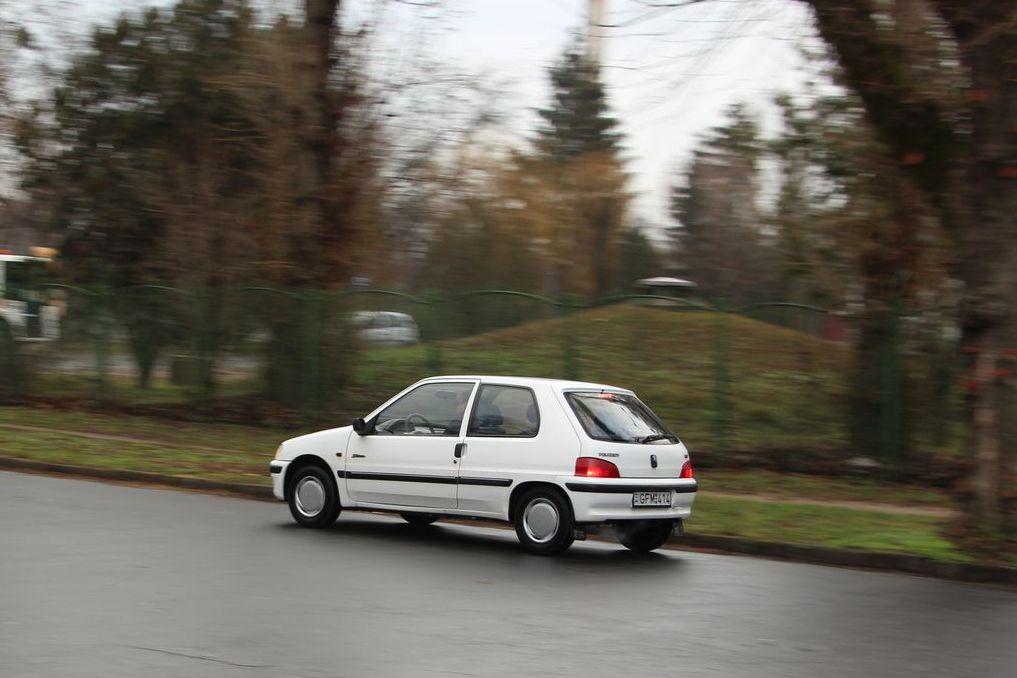 Milyen autó mai szemmel egy 1996-os 106-os? Elsőre furcsa. Franciázni, meg autónáculni kár, mégis be kell valljam, a mi 106-osunkon (is) minden elektromos cucc igényel némi hunyorítást, magyarázatot. Az autóhoz lépve az első negatív élmény az egykoron büszkén kattanó elektromos centrálzár esetleges működése. Beindítása egy másik rejtélyes hiba miatt kicsit bajos, hidegen gáz nélkül lefullad, még nyáron is. Ha elhelyezkedünk az állíthatatlan, már morzsolódó kormány mögött, hamar megtaláljuk a csapatáshoz ideális skandináv ralipozíciót a puha szivacsú, nulla oldaltartású apró ülésekben. A tompítottat felkapcsolva a magasságállító-motorok elkezdik lifteztetni a lámpákat, majd betalálják a kiindulási pozíciót. Innentől egy kicsit Louis de Funès hangulatú lesz minden, de ami innen jön, magáért beszél. Negyedmilliós válságautókhoz képest tisztességesen halad a 106. Érezhető a fékhatás, a sebesség mellett rémesen elkönnyülő, méretes holtjátékú, szervótlan kormánnyal alapvetően pontosan irányítható az autó. A kisebb úthibákat zokszó nélkül, a nagyobbakat apró nyögéssel, a keresztbordákat a kalaptartó rezgetésével, de eldolgozza a futómű. Kanyarban bólintva köszön a járókelőknek, de állatkodás nélkül mindig íven marad. Állatkodva szinte biztosan, de amúgy is könnyen megakad a nem túl pontosan megvezetett hosszú váltóbot a fokozatok között. Ilyenkor még viccesebb lesz a befecskendezős motor brummogása, de az Euro 2-es gázreakciója meglepően jó a mai autókéhoz képest. Hevesebb irányváltásnál a futómű kér egy kis gondolkodási időt. Először az ív belseje felé bólint, majd ha még mindig akarunk kanyarodni, elkezd szépen oldalra kúszni, ha meg nagyon akarunk, simán elemeli az ívbelső hátsó kerekét. Mindvégig jótékonyan orrtolós marad, csak hülyegyerekes fékezéssel és kiprovokált terhelésváltásokkal lehet elérni, hogy a hátulja meg akarja előzni az elejét a ballonos virsligumikon.
