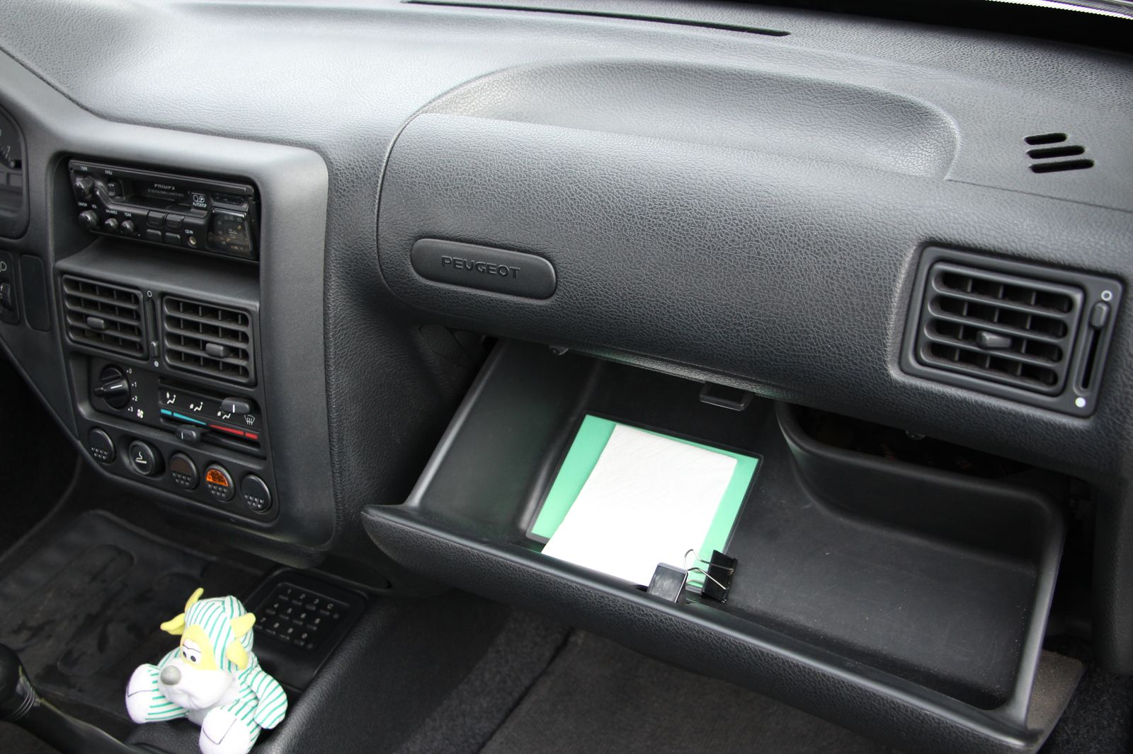 Fordulatszámmérő nem jutott, csak óra. Peugeot-felirat virít az Airbag-jelölés helyett. Nem hogy utas-, még vezetőoldali légzsák sincs. Mindkettő feláras volt az 1.1-eshez