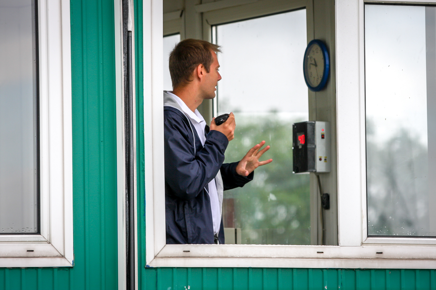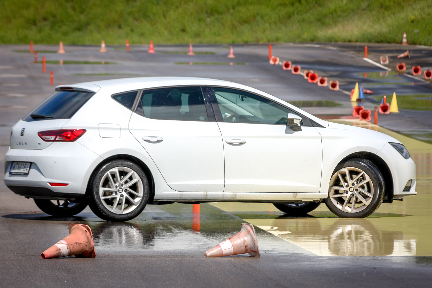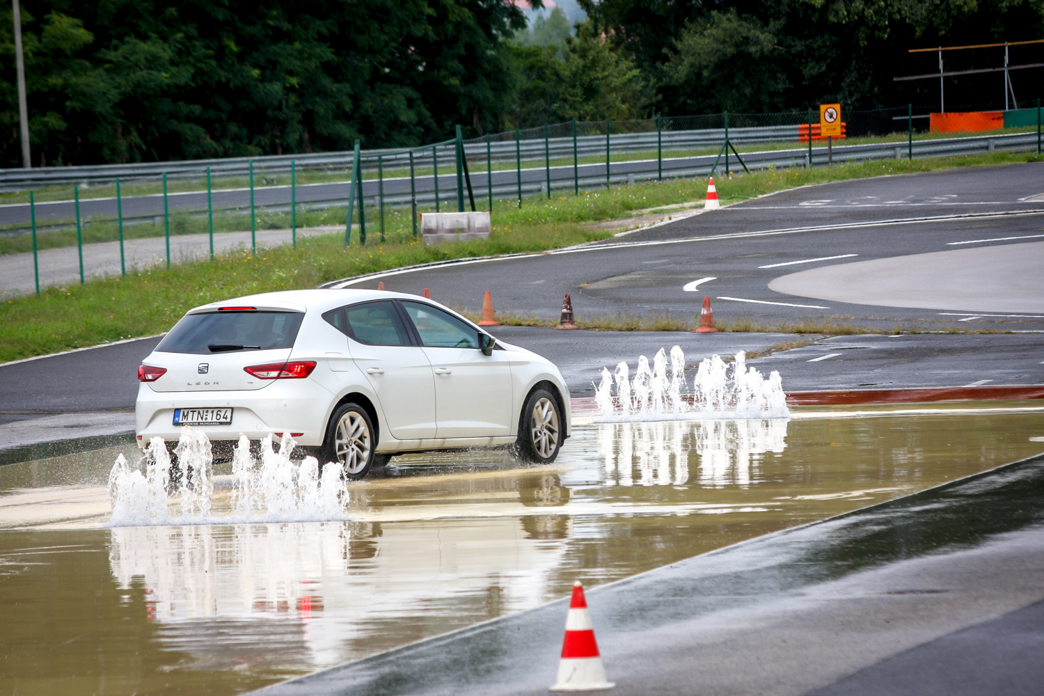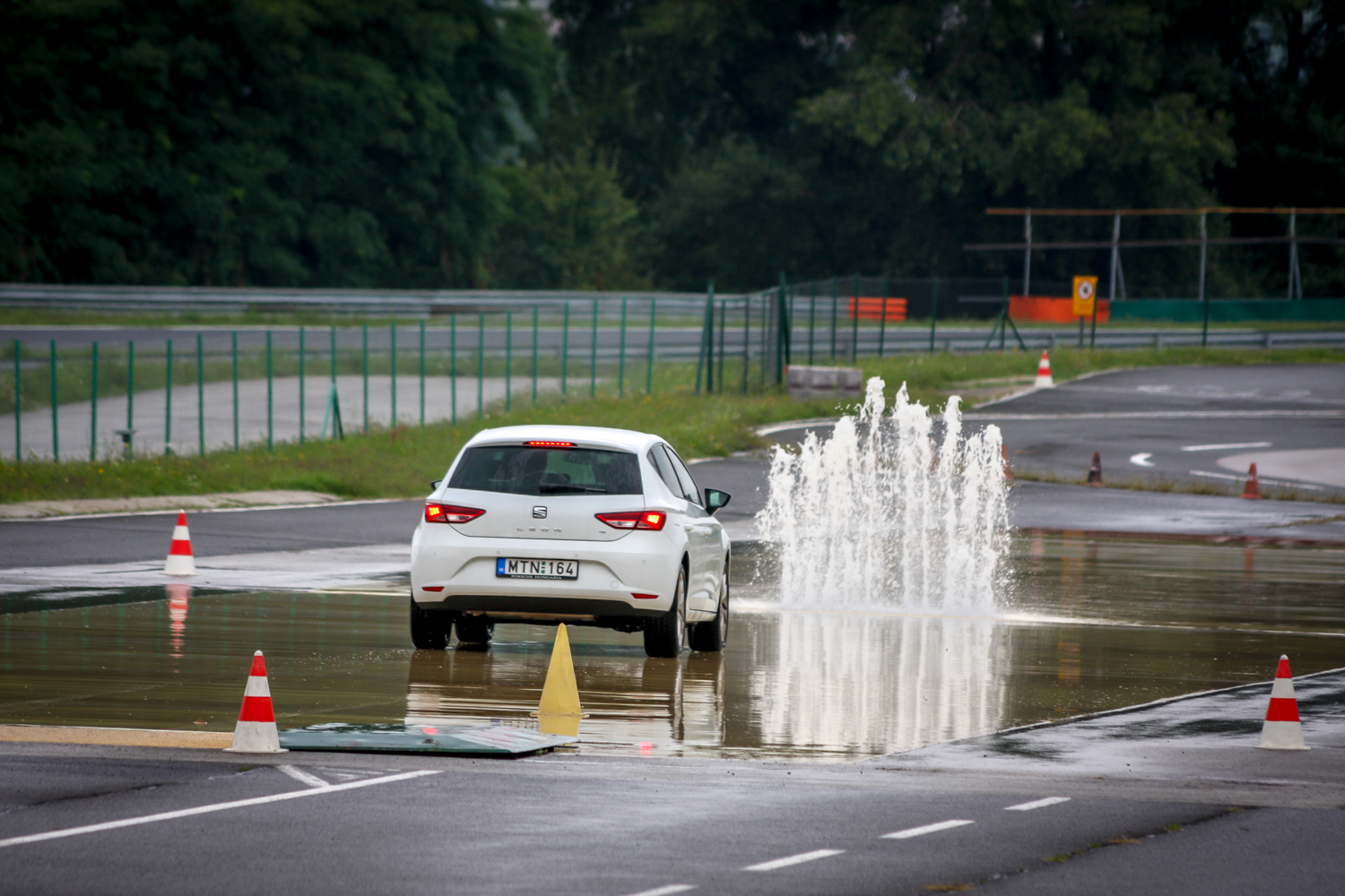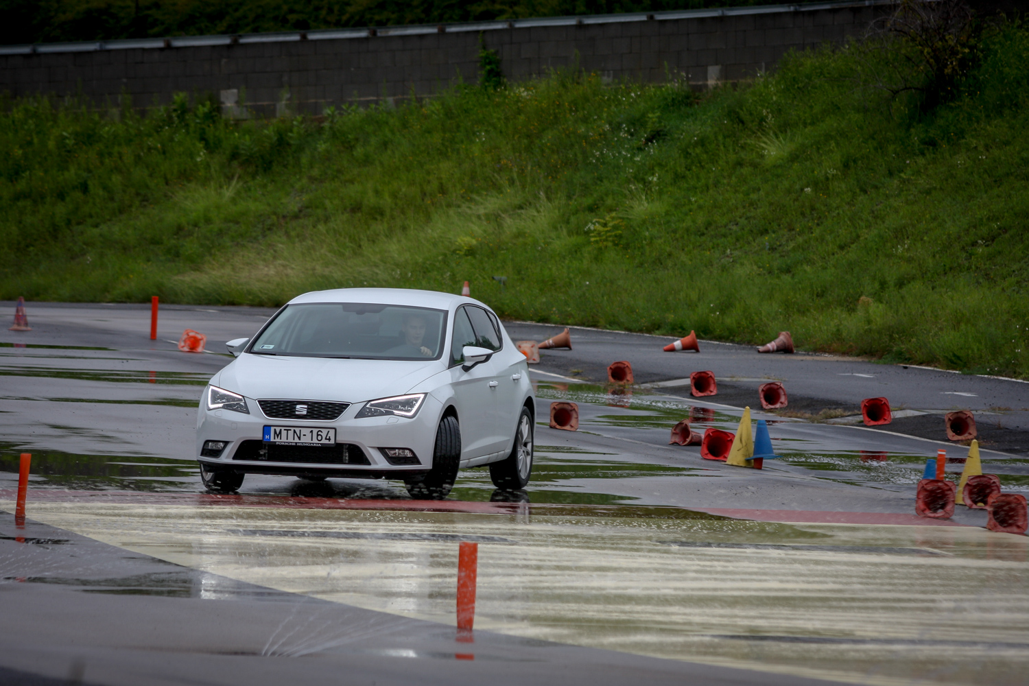 Majd jött a gyakorlatozás, ami úgy néz ki, hogy a tanuló rádión keresztül hallja, mit kell csinálnia. A programban fékezés, akadálykikerülés, rántópadozás utáni kikerülés szerepel csúszós felületen. Szabad sebességválasztással, aztán olyan sebességgel, amit az instruktor javasol, majd a tempón emelve, végül ismét szabad sebességválasztással, ám láss csodát, a tanuló ekkorra már eljut oda, hogy magától tudja, mi az a sebesség, amivel képes lesz megoldani a feladatot. Egyszerű, de zseniális módszer.