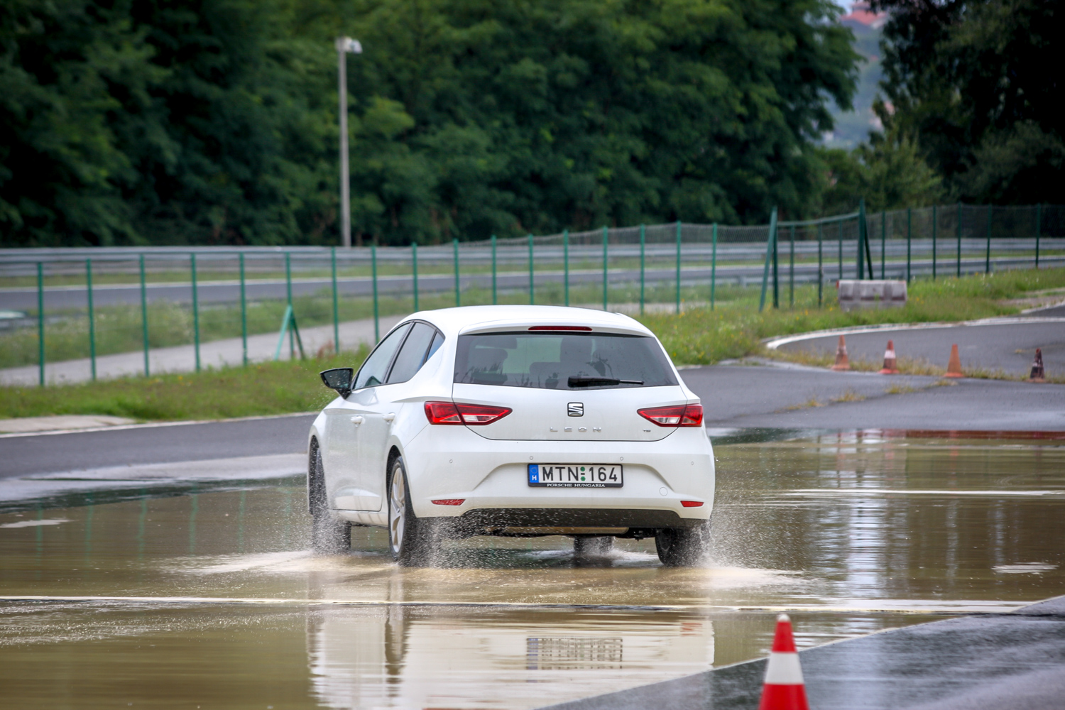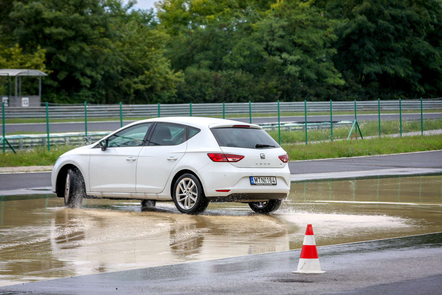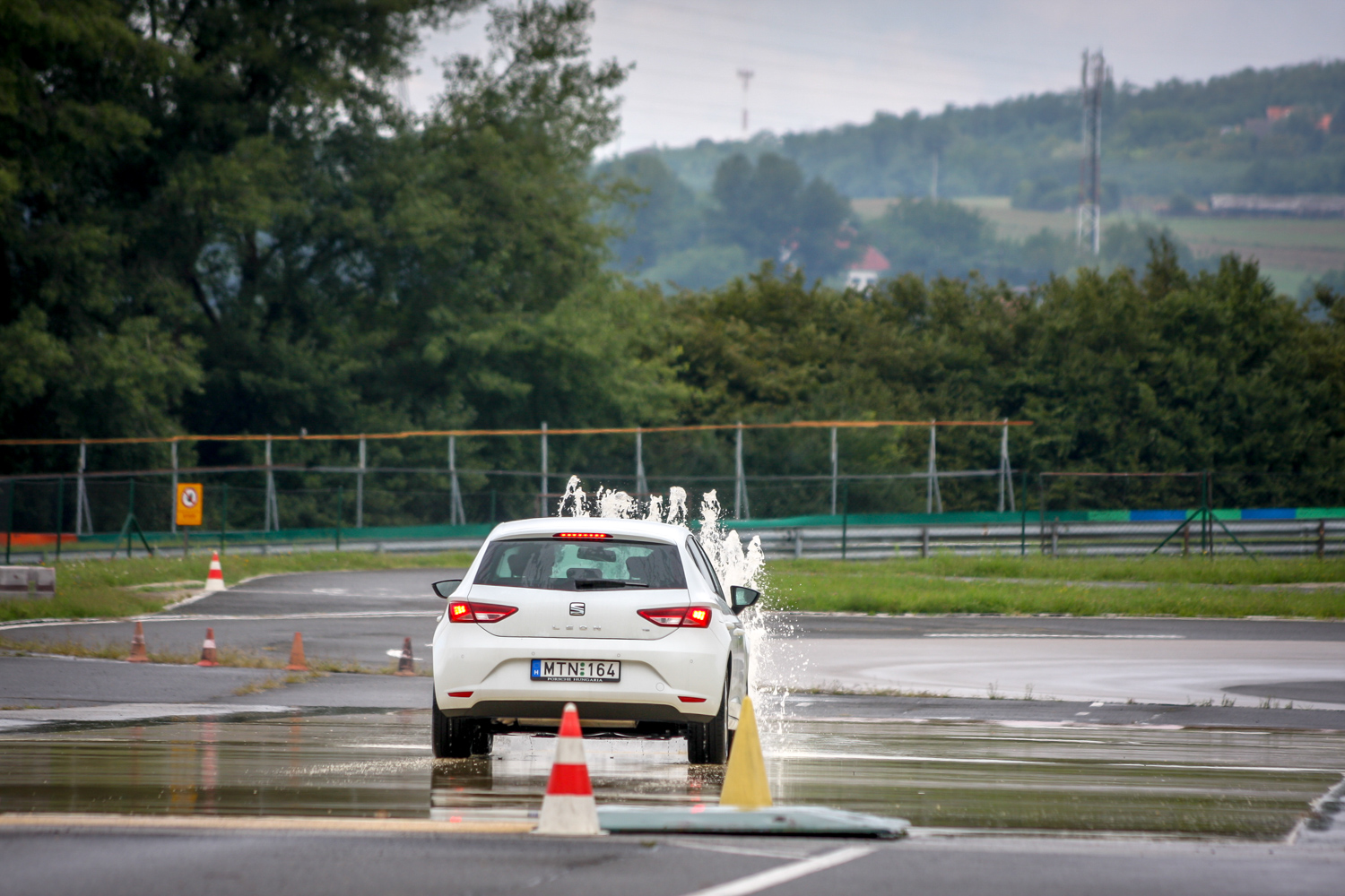 Balázs, a tanuló elmondta, hogy a jogosítványa több mint 100 ezer forintba került. András, az instruktor elmondta, hogy az alapképzés 20 ezer forint környékén akár már komoly megtakarítást is jelenthet. És – nagyon sajnos – elenyésző azok száma, akik friss jogsival beneveznek egy ilyen tanfolyamra. Holott pillanatok alatt látványos fejlődést lehet elérni, s erről – Balázs példáján át – magunk is meggyőződhettünk a Tanpályán. Tesztalanyunk egy kis üléspróbát, szintfelmérést és eligazítást követően, de még a gyakorlatozás előtt kétszer végigment a kijelölt sztenderd szlalomon. Váltakozó burkolaton, gyors, kemény, precíz kormányzást és bölcs sebességválasztást igénylő pályán, ami kitűnően mutatja, milyen szinten van a sofőr. Azt az infót kapta, hogy a második köre lesz a mért, az etalon. Az instruktor viszont suttyomban a próbakörét is mérte, s ennek az eredménye 65 mp lett. A „hivatalosé” meg 77 mp, amiben Balázs rontott, kipördült – ez általános, szinte mindenkinél így szokott lenni, jegyezte meg a szakember.