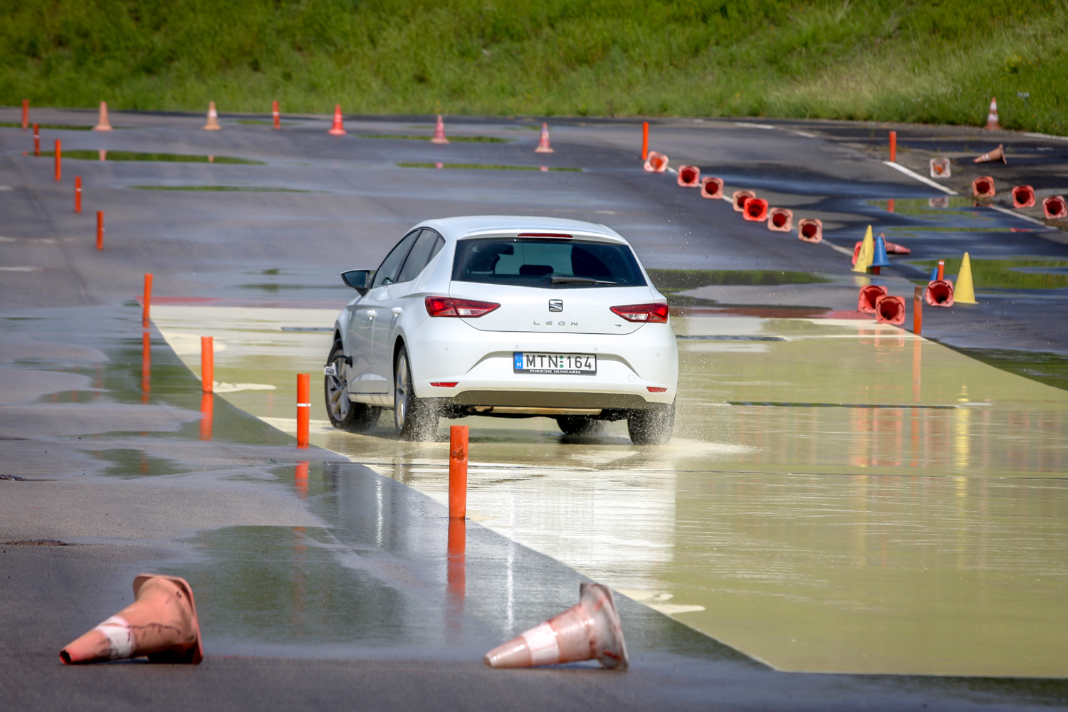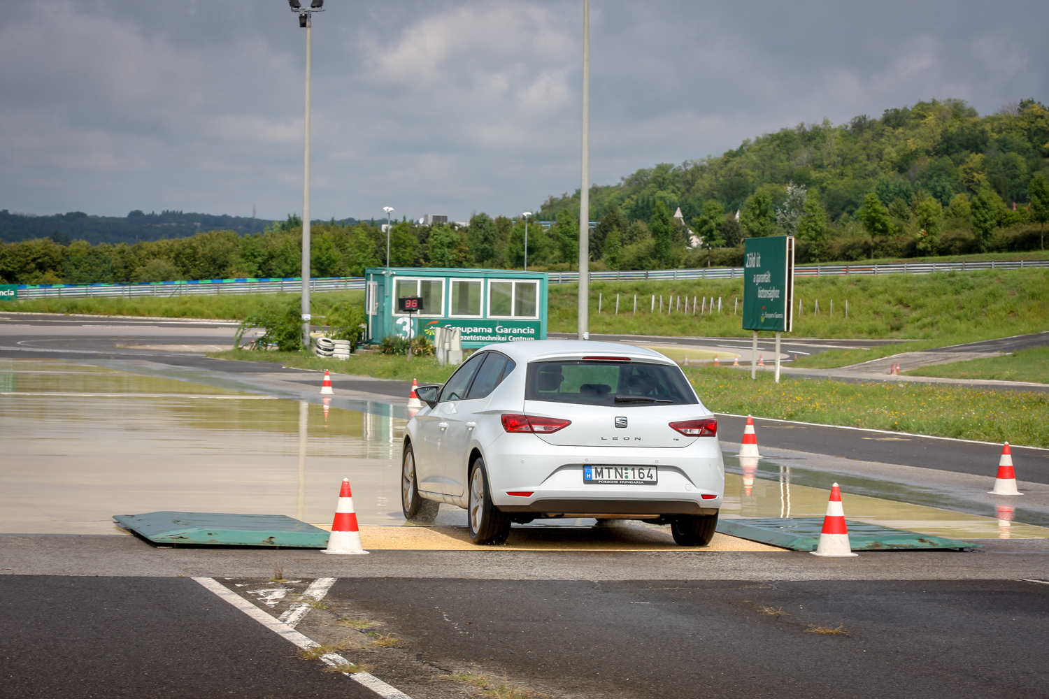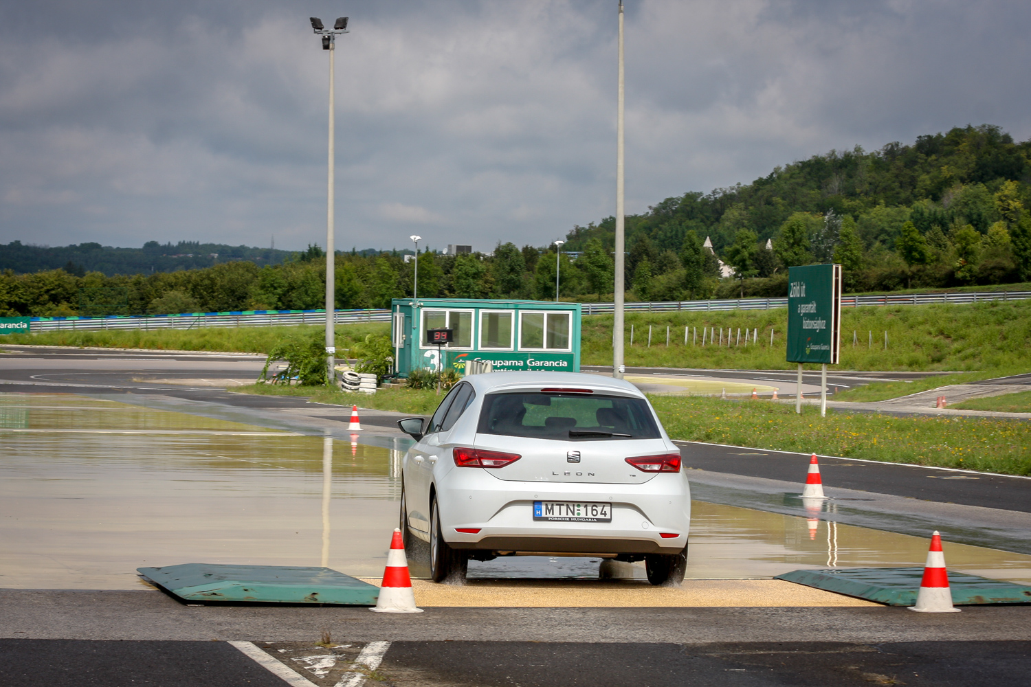 Balázs, a tanuló elmondta, hogy a jogosítványa több mint 100 ezer forintba került. András, az instruktor elmondta, hogy az alapképzés 20 ezer forint környékén akár már komoly megtakarítást is jelenthet. És – nagyon sajnos – elenyésző azok száma, akik friss jogsival beneveznek egy ilyen tanfolyamra. Holott pillanatok alatt látványos fejlődést lehet elérni, s erről – Balázs példáján át – magunk is meggyőződhettünk a Tanpályán. Tesztalanyunk egy kis üléspróbát, szintfelmérést és eligazítást követően, de még a gyakorlatozás előtt kétszer végigment a kijelölt sztenderd szlalomon. Váltakozó burkolaton, gyors, kemény, precíz kormányzást és bölcs sebességválasztást igénylő pályán, ami kitűnően mutatja, milyen szinten van a sofőr. Azt az infót kapta, hogy a második köre lesz a mért, az etalon. Az instruktor viszont suttyomban a próbakörét is mérte, s ennek az eredménye 65 mp lett. A „hivatalosé” meg 77 mp, amiben Balázs rontott, kipördült – ez általános, szinte mindenkinél így szokott lenni, jegyezte meg a szakember.