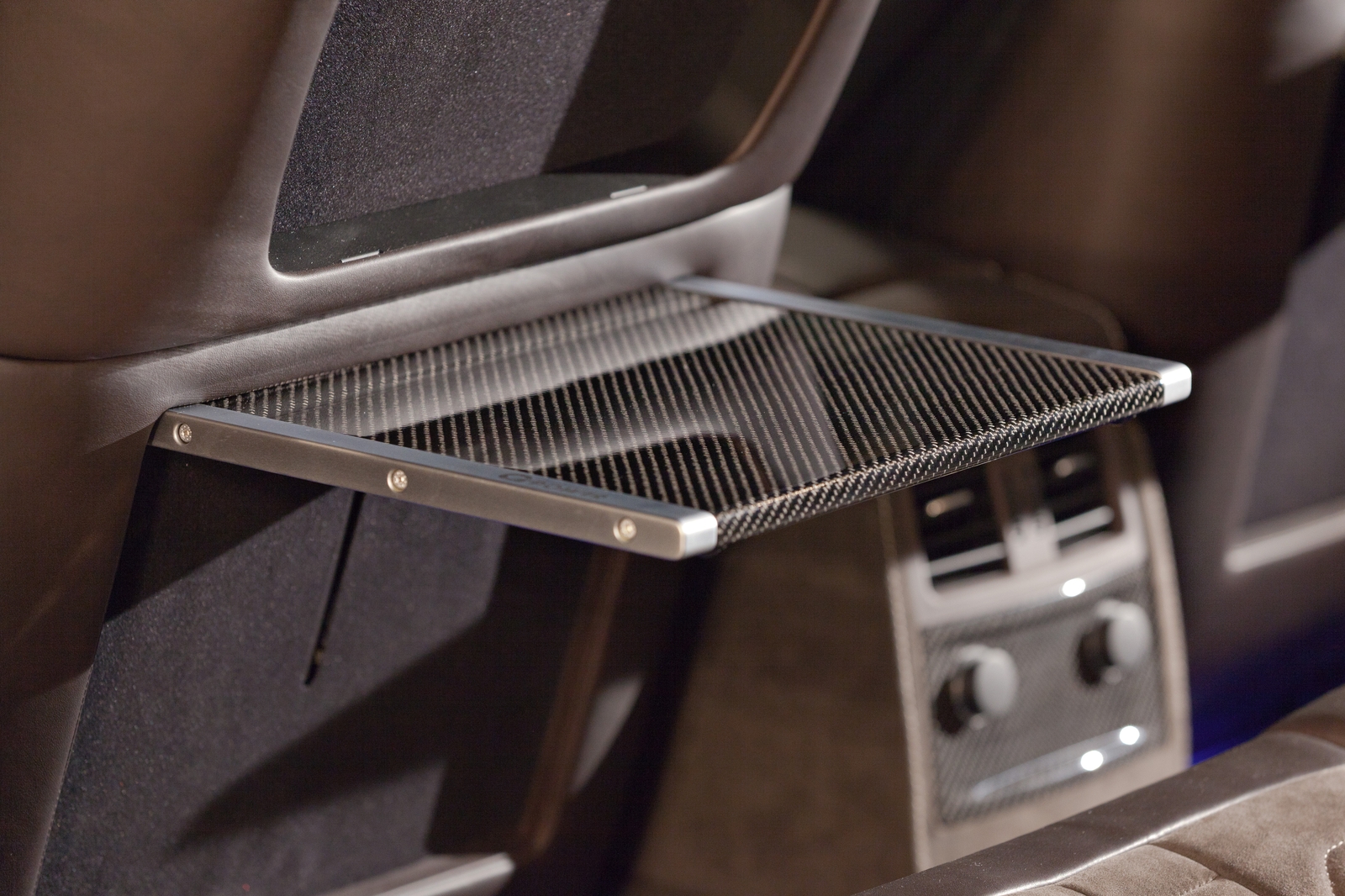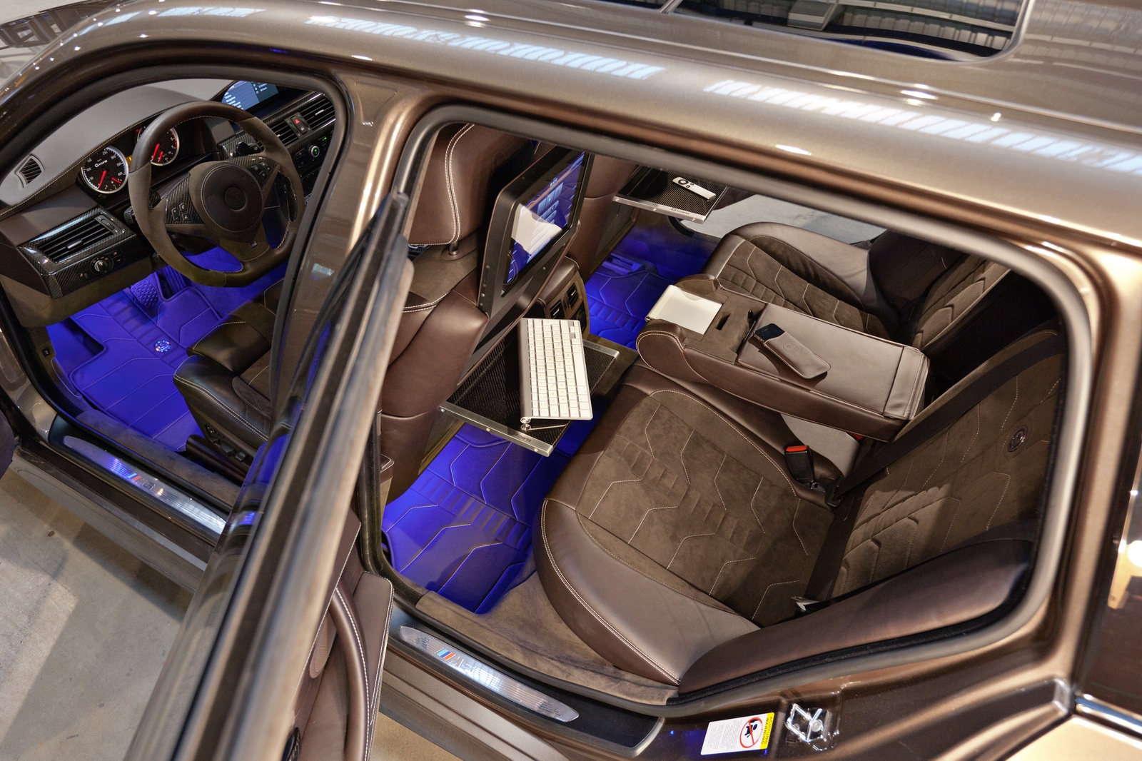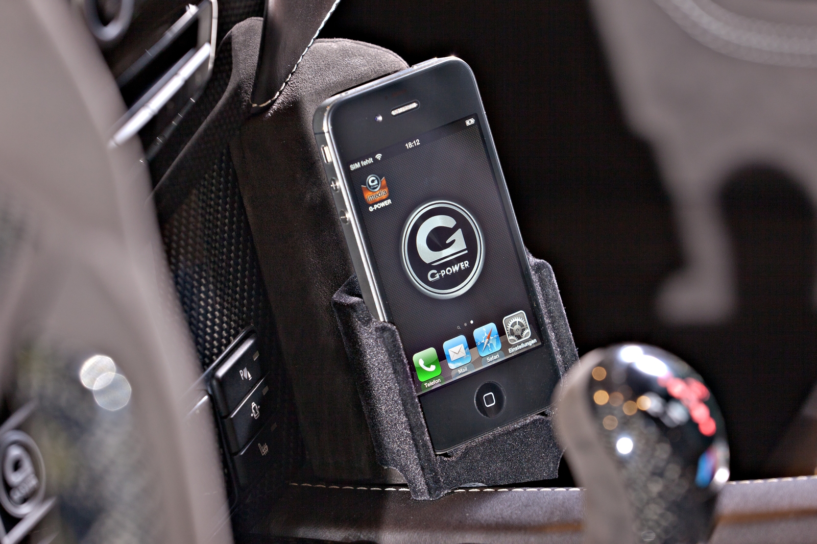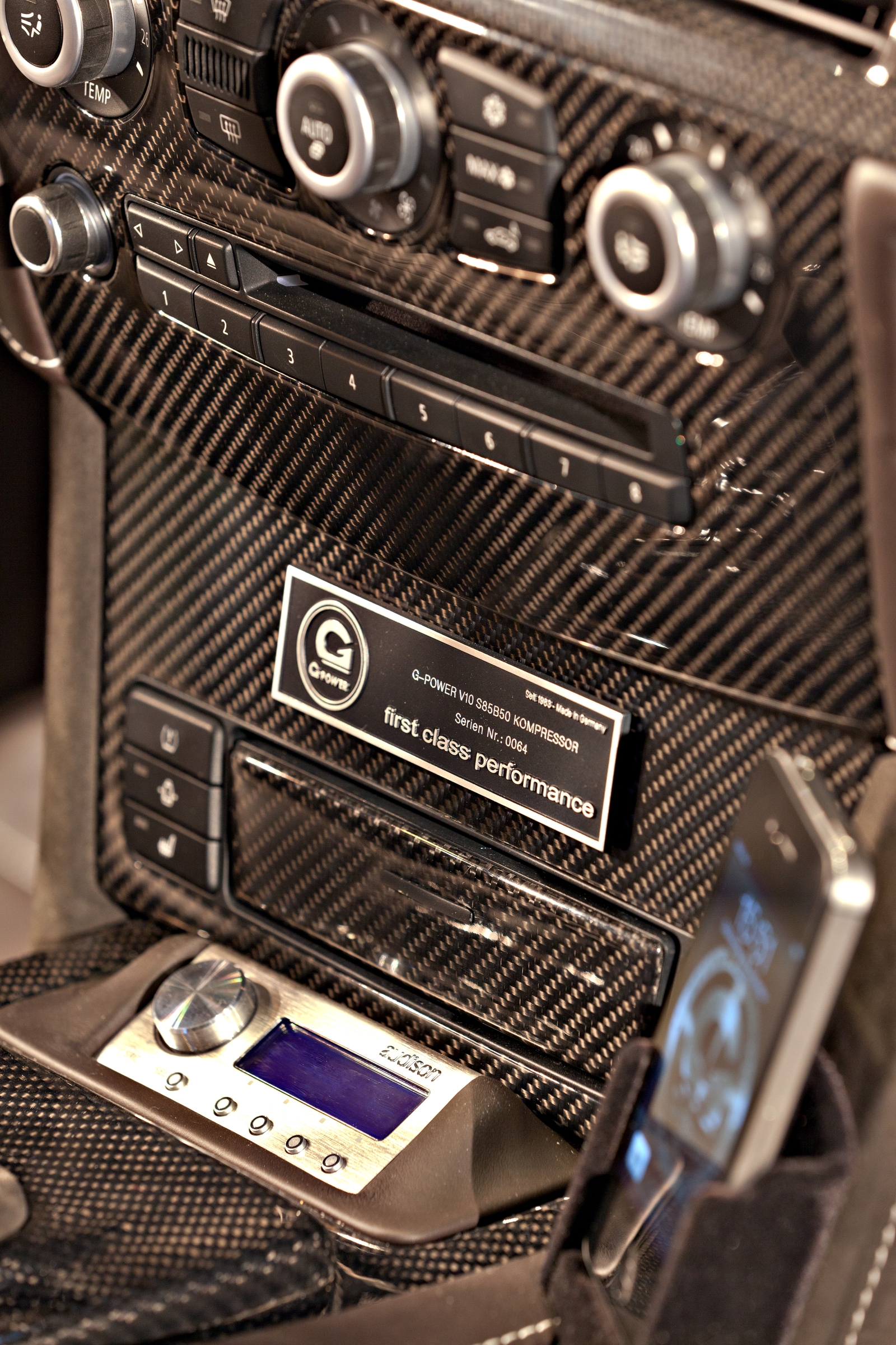 Az utastér a karbonszálas betétek mellé Alcantara kárpitozást, iPhone integrációt, hátra két kisebb és egy tetőből lehajtható, iMac számítógépre kötött óriási monitort kapott vezeték nélküli billentyűzetekkel. Ha esetleg nem lenne elég nyomkodni való, a csomagtér erősítőket is rejtő padlójában van még két iPad, az utastér összes elektronikája és világítása is ezen készülékekről, a G-Power saját alkalmazásával (is) vezérelhető.