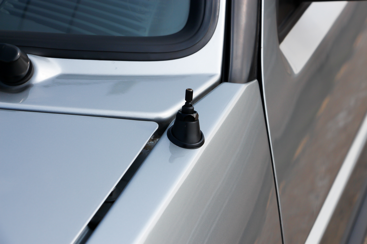 A gyári, de utólag felszerelt antenna, a retrófeliratos Sicursiv üvegek és a korszakos kék tükörlap is mind kedves részlet