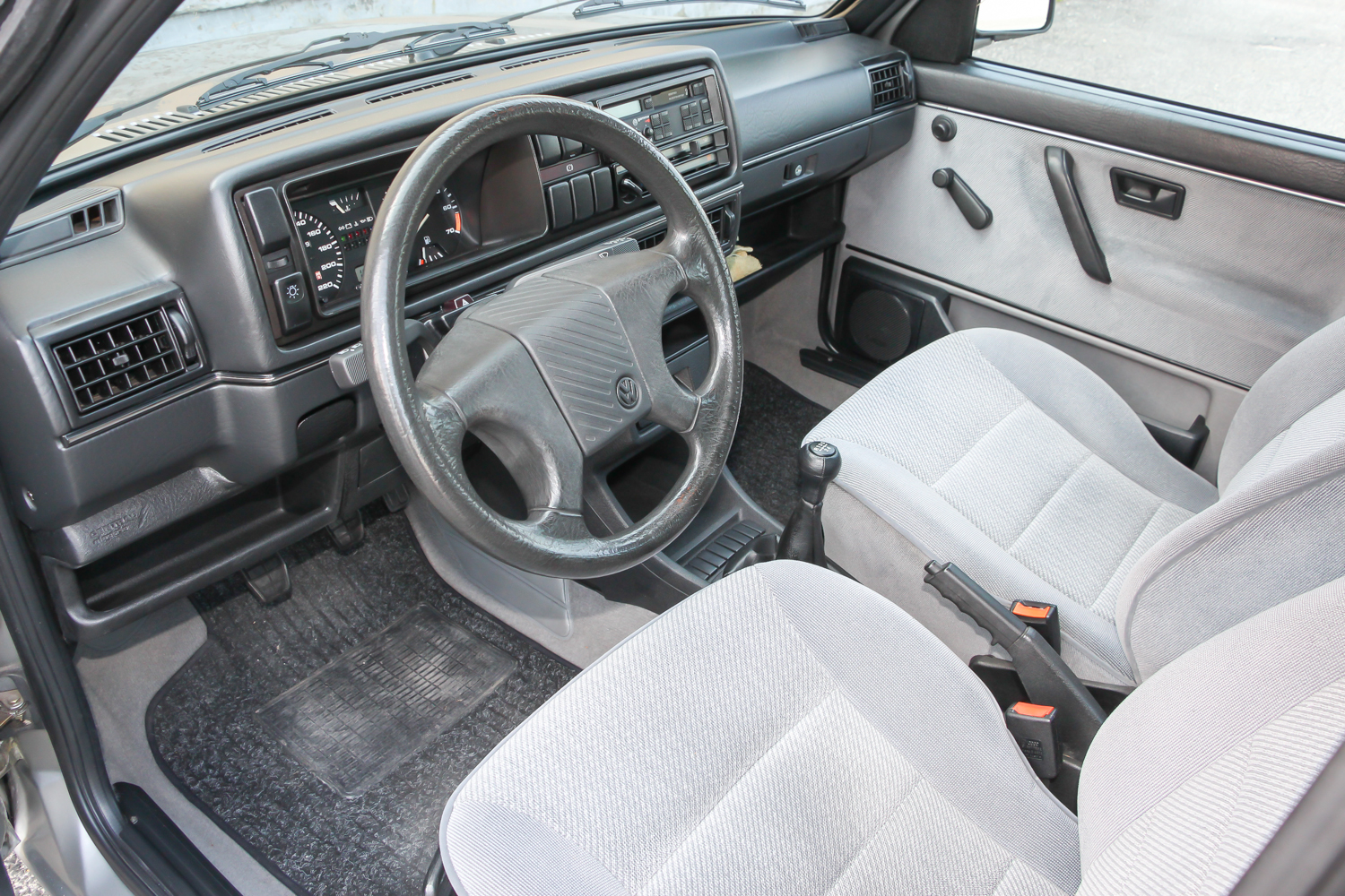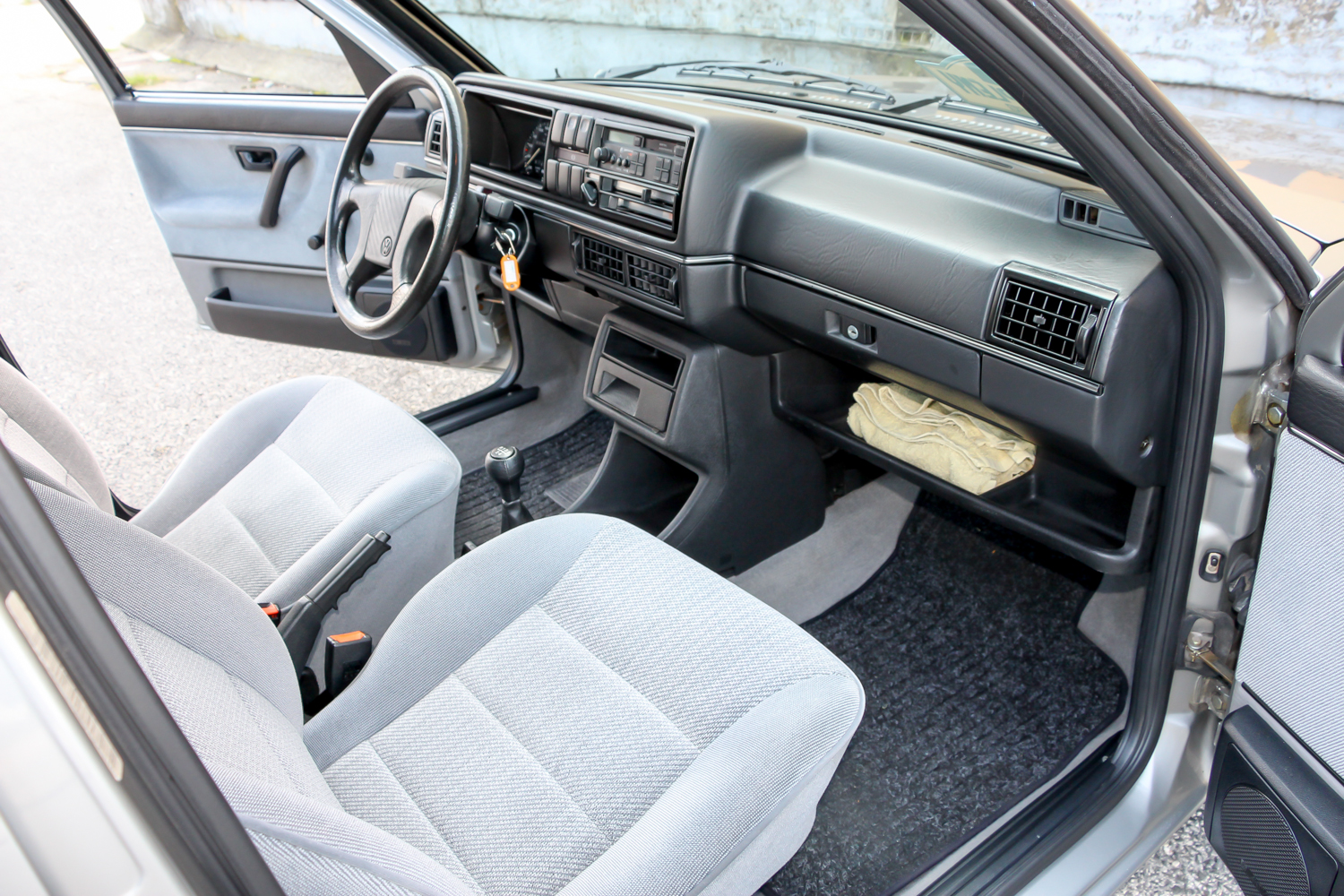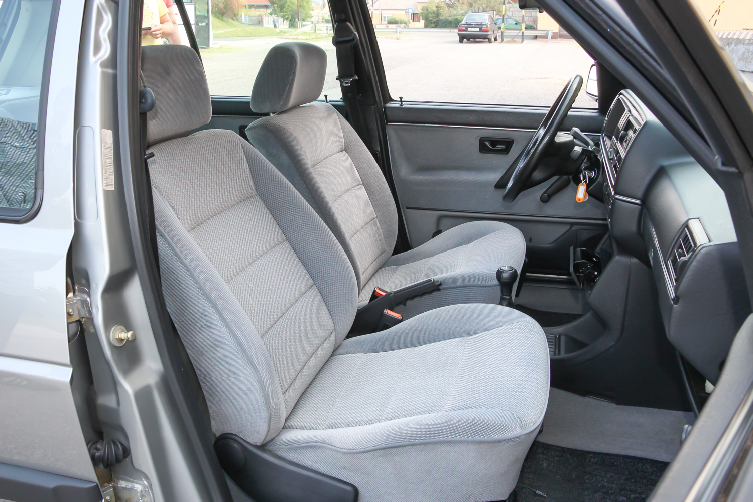 A középszürke kettes meg kicsit méltatlanul árválkodott, pedig ritka szép állapotban van. Kollégám és én nem bántuk, hogy kiszorultunk a Transporterből. Igaz, nekik egy Ford Escort, nekünk egy Opel Kadett jelentette anno a nagybetűs, bűvös, első nyugati autót, mégis hamar megvolt a lelki szál a kettes Golffal. Nem volt nehéz az ismerkedés, a finom tweed mintás szürke kárpitozású utastérben rögtön elfogott egyfajta jóleső otthonosság. Gyerekkoromban ültem utoljára kettes Golfban, német családi barátaink jöttek ilyennel Budapestre, de ebben akkoriban még semmi különleges nem volt.
