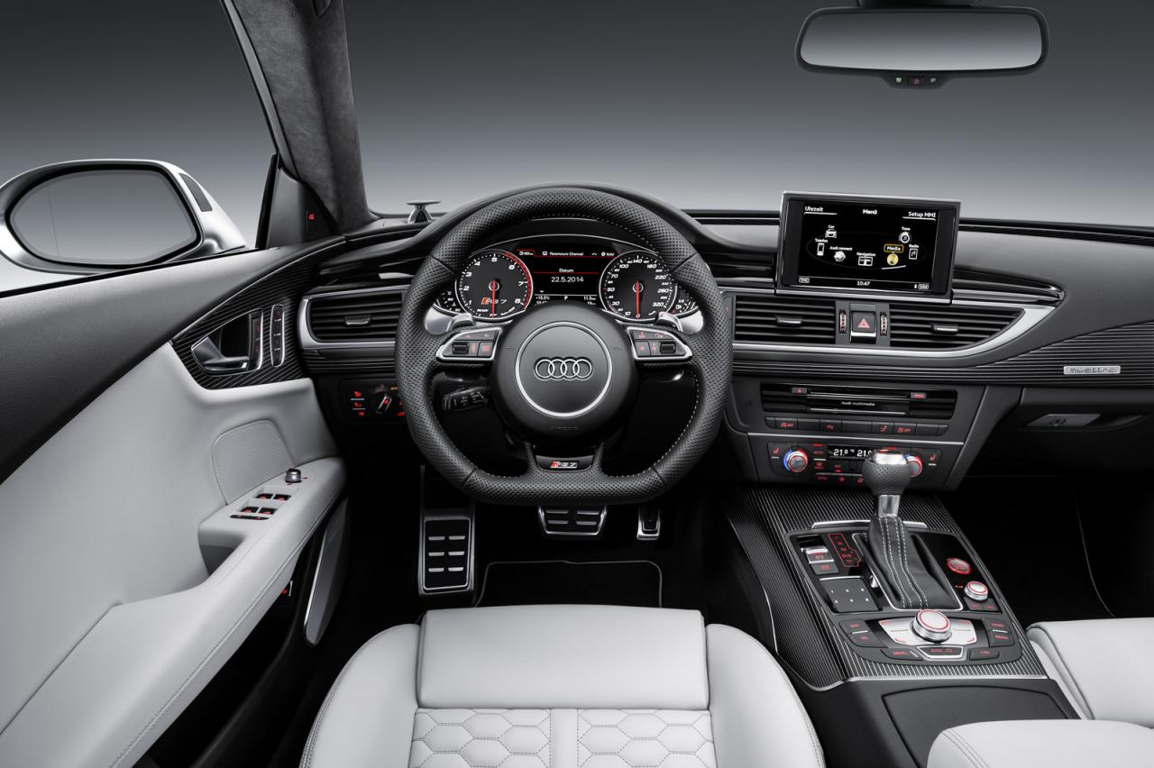 A beltérben finoman módosult a műszeregység és a légbeömlők formája. A típusrajongók jegyezzék fel hogy újak a kormány mögötti váltófülek és a quattro felirat, valamint az MMI kezelőfelülete is. A 4,0 literes dupla turbós V8-as motor ereje változatlan, így is bődületes 560 lóerőt tud, és 700 Nm a nyomatéka. Az RS7 gyorsulása 3,9 másodperc százig, végsebsíssége akár 305 km/h is lehet az opciós sportcsomaggal. A hajtás természetesen quattro, a váltó nyolcfokozatú Tiptronic.