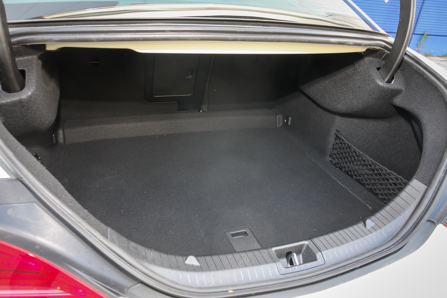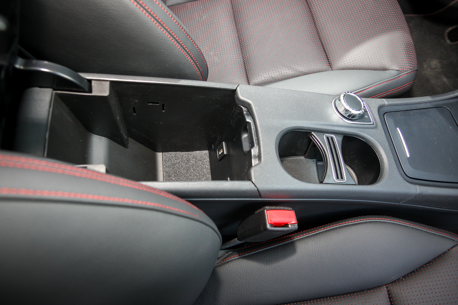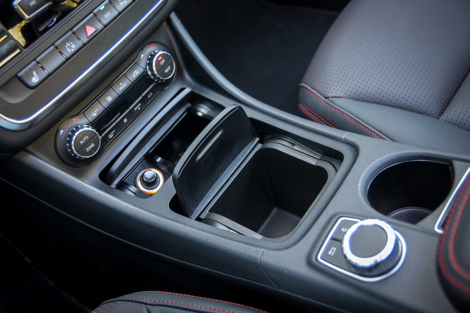 A forma oltárán még a szűk raktérnyílással adózunk. A csomagtér nem apró, 470 literes, de a rakodóperem magas, az üreg mély és lapos. És? Cserébe az A-osztályos utastér vörös cérnával varrott fekete bőrös, a műanyagok puhák, a minőségérzet tökéletes. Ez tényleg prémiumautó. Amibe bele lehet kötni, az a középkonzol tetején fixen trónoló kis monitor – tán elegánsabb lett volna úgy megoldani, ahogy az Audinál láttuk, eltüntethetően. De azért együtt lehet élni a látványával, a képe éles, a kezelése pedig a könyöklő előtt figyelő tekerő/nyomógombbal pofonegyszerű.