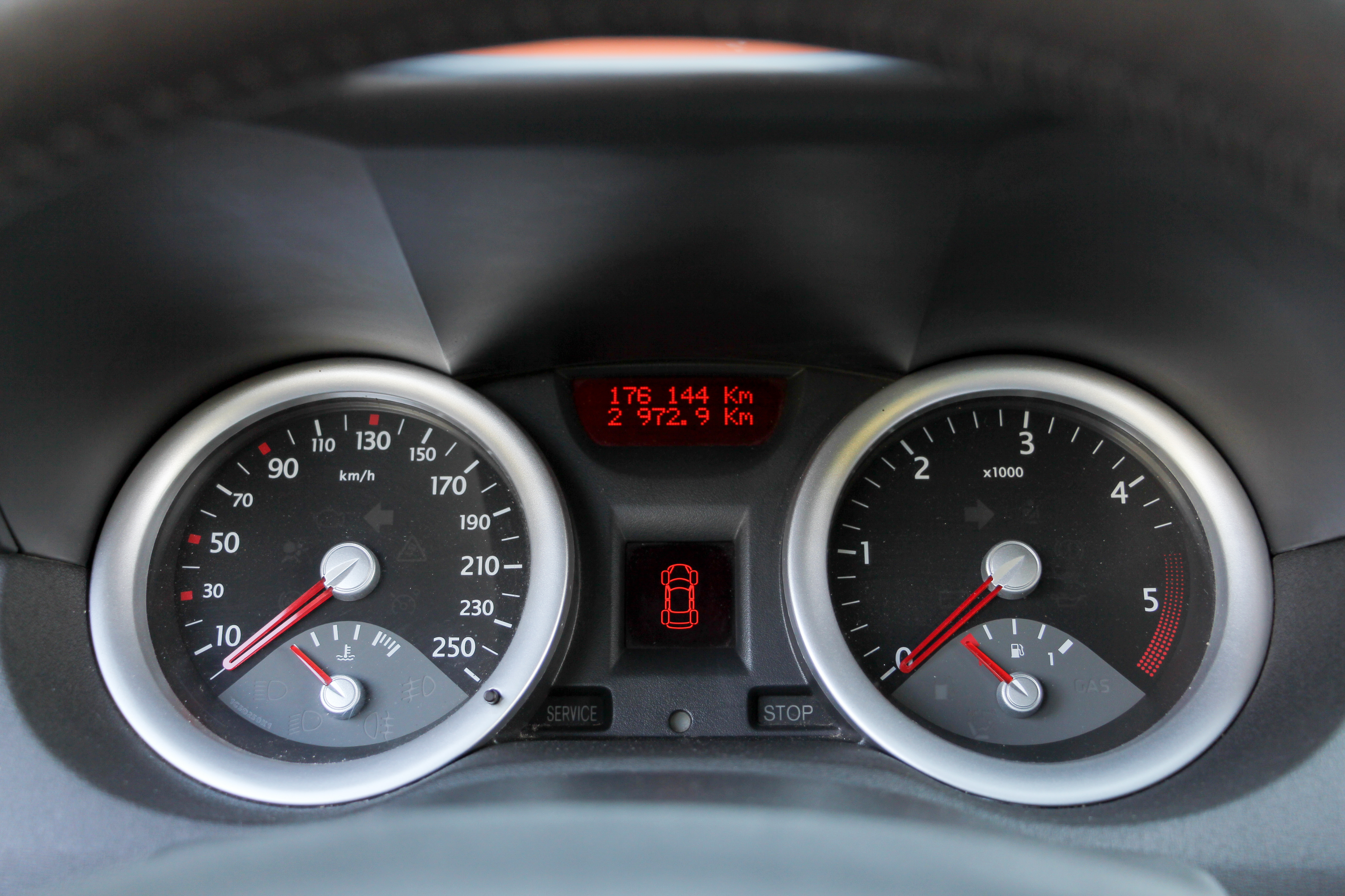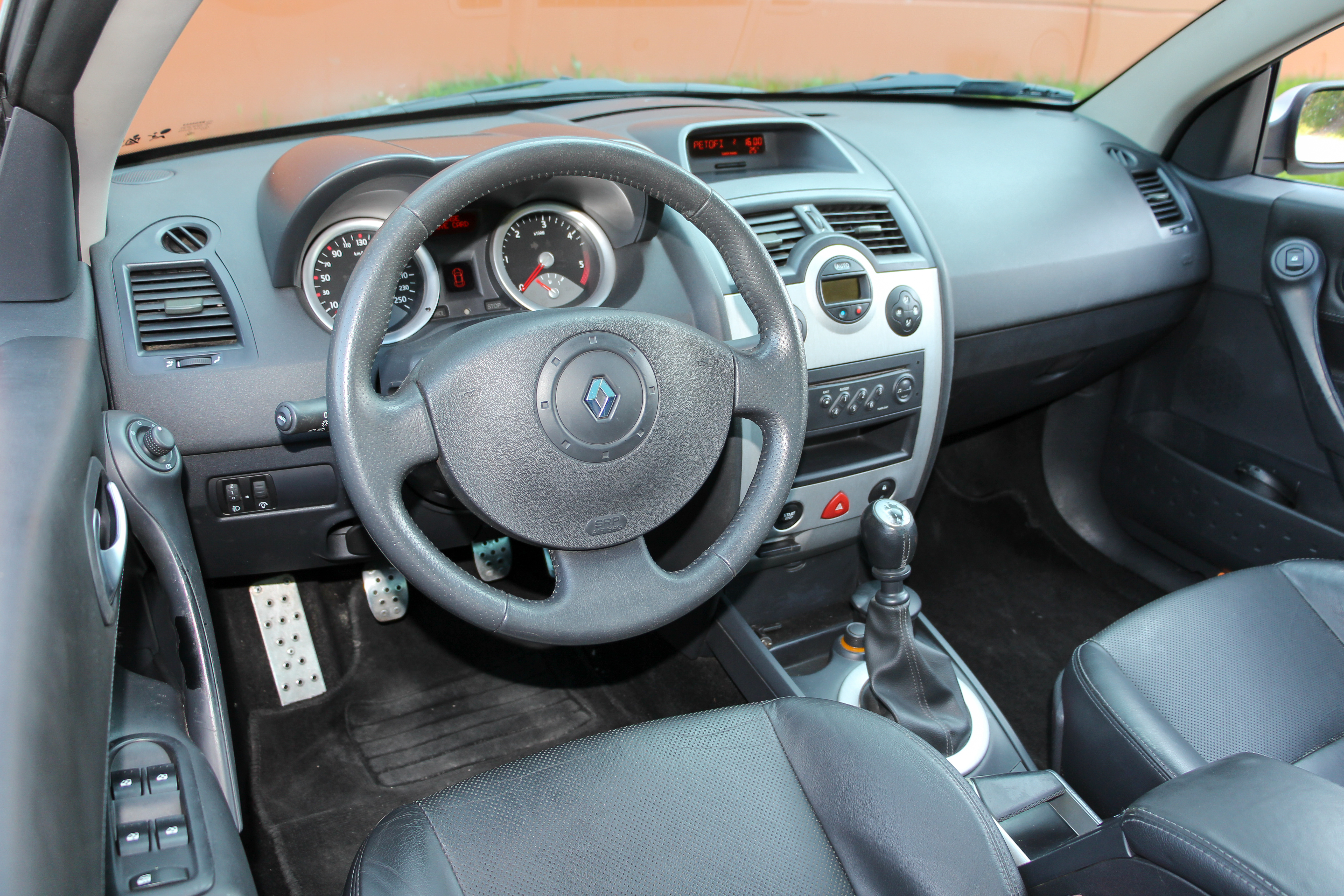 Mégane-műszerfal a frissítés előtti időszakból, tempomat nélkül, de automata klímával, távirányítós hifivel, fém pedáltaposókkal